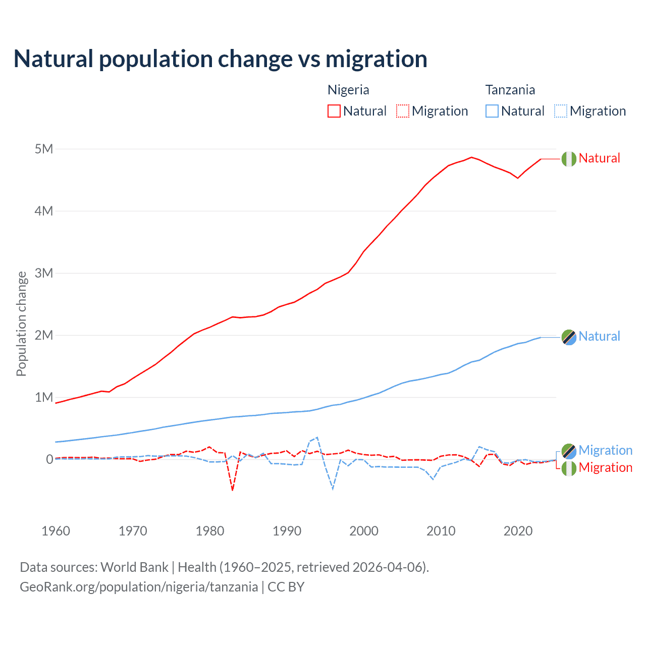 Over the last 10 years, 99.2% of the population change in Nigeria is from natural causes (a gain of 47,163,517 people) and 0.77% is from migration (a loss of 368,103 people). In Tanzania 98.7% is from natural causes (a gain of 17,769,541 people) and 1.27% is from migration (a gain of 229,466 people).