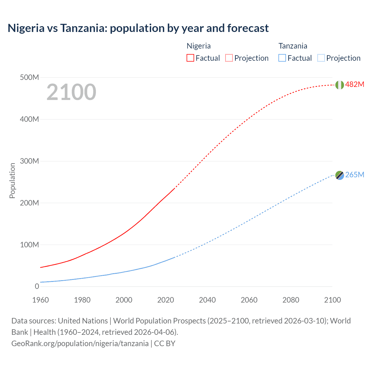 Nigeria vs Tanzania: population by year and forecast