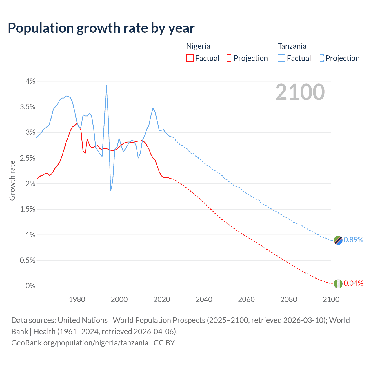 Data sources: World Bank | Health (1960–2024, retrieved 2026-04-06); United Nations | World Population Prospects (1960–2026, retrieved 2026-03-10); U.S. Census Bureau (1960–2025, retrieved 2026-02-08); Central Intelligence Agency (CIA) (2000–2019, retrieved 2026-02-20).
