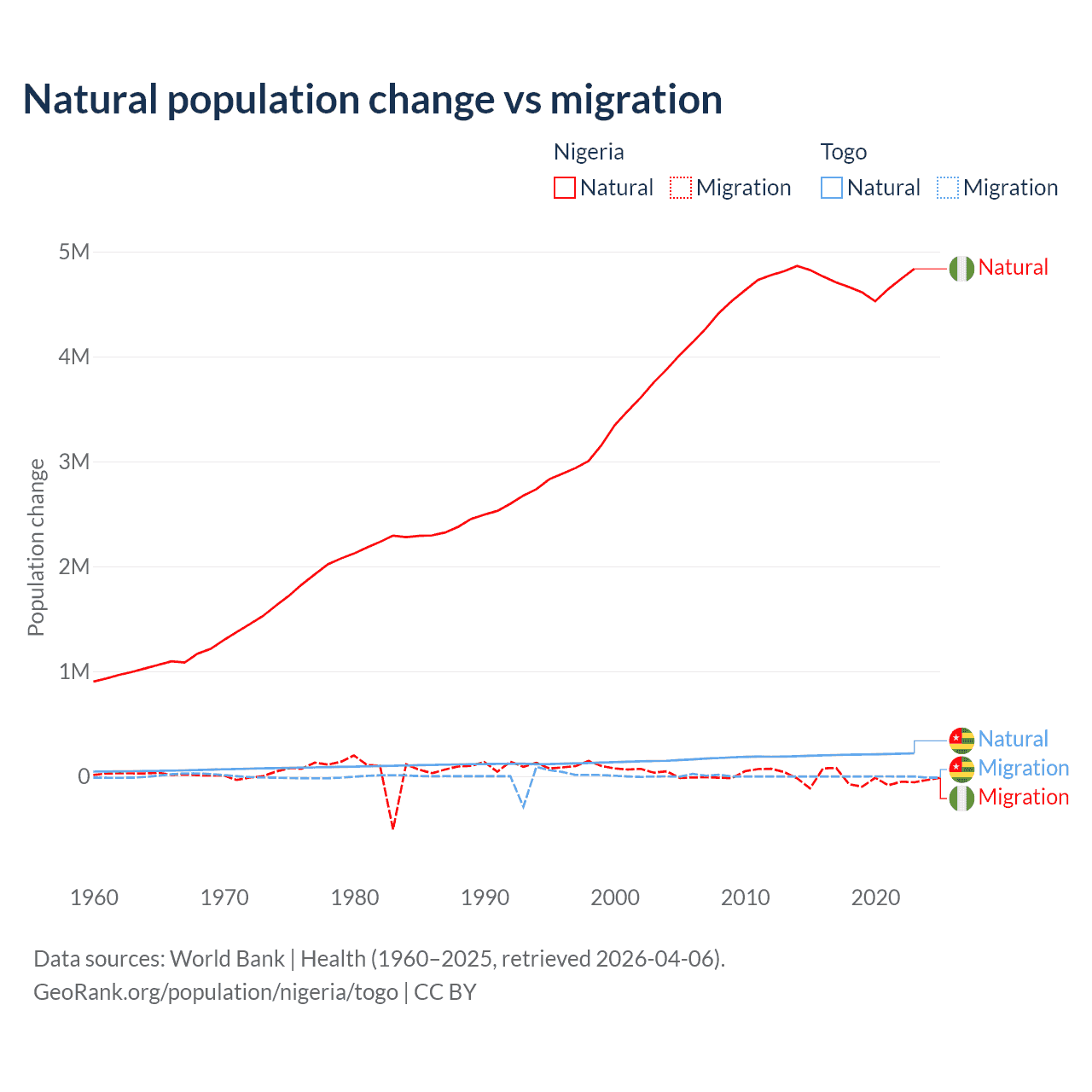 Over the last 10 years, 99.2% of the population change in Nigeria is from natural causes (a gain of 47,163,517 people) and 0.77% is from migration (a loss of 368,103 people). In Togo 99.1% is from natural causes (a gain of 2,052,115 people) and 0.86% is from migration (a loss of 17,852 people).