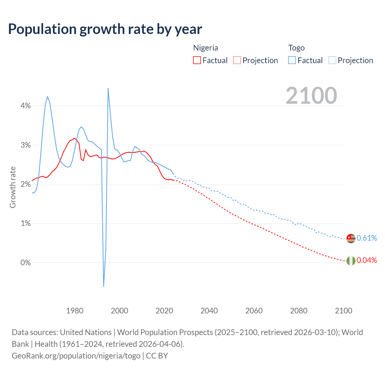 - For the last 10 years, Nigeria has had an average growth rate of +2.31% per year vs +2.46% in Togo.