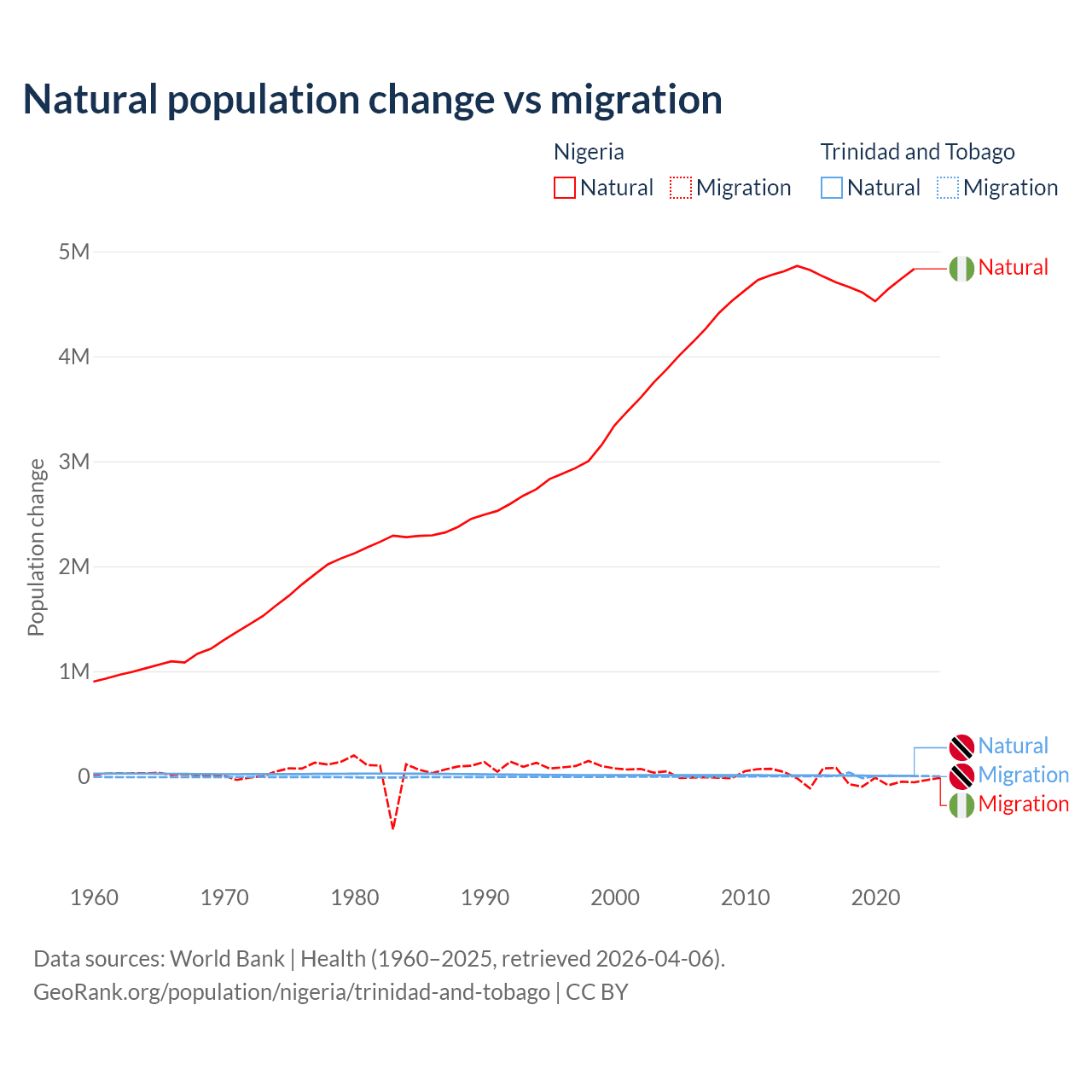 Over the last 10 years, 99.2% of the population change in Nigeria is from natural causes (a gain of 47,163,517 people) and 0.77% is from migration (a loss of 368,103 people). In Trinidad and Tobago 66% is from natural causes (a gain of 55,887 people) and 34% is from migration (a gain of 28,785 people).