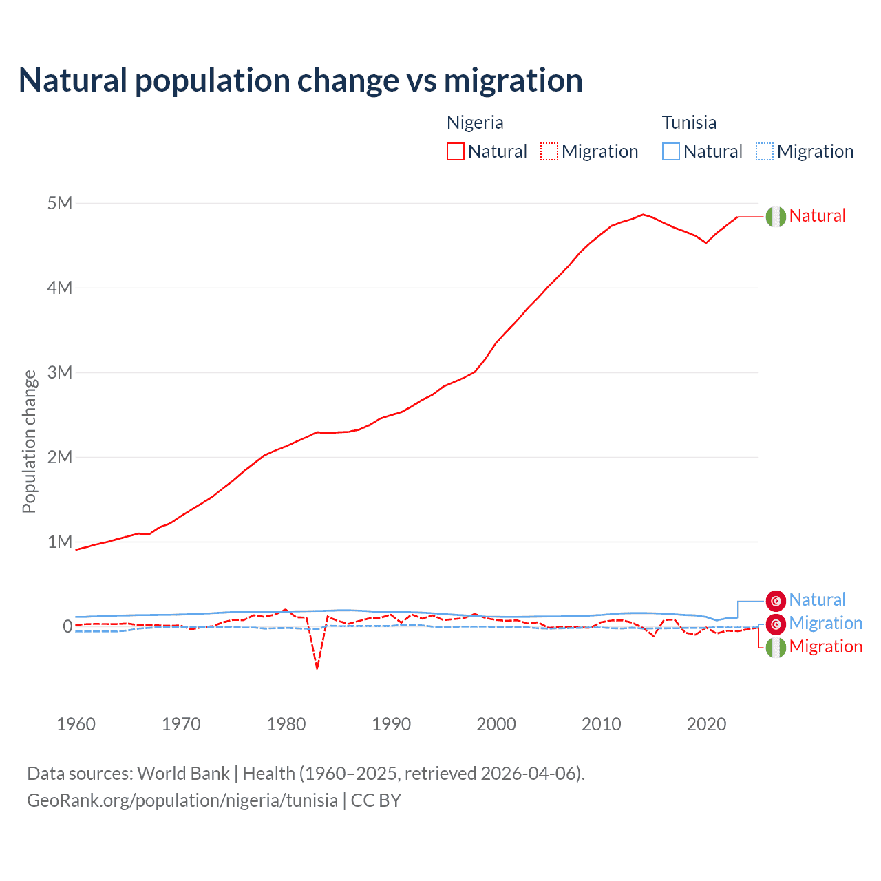 Over the last 10 years, 99.2% of the population change in Nigeria is from natural causes (a gain of 47,163,517 people) and 0.77% is from migration (a loss of 368,103 people). In Tunisia 86.3% is from natural causes (a gain of 1,225,079 people) and 13.7% is from migration (a loss of 195,011 people).