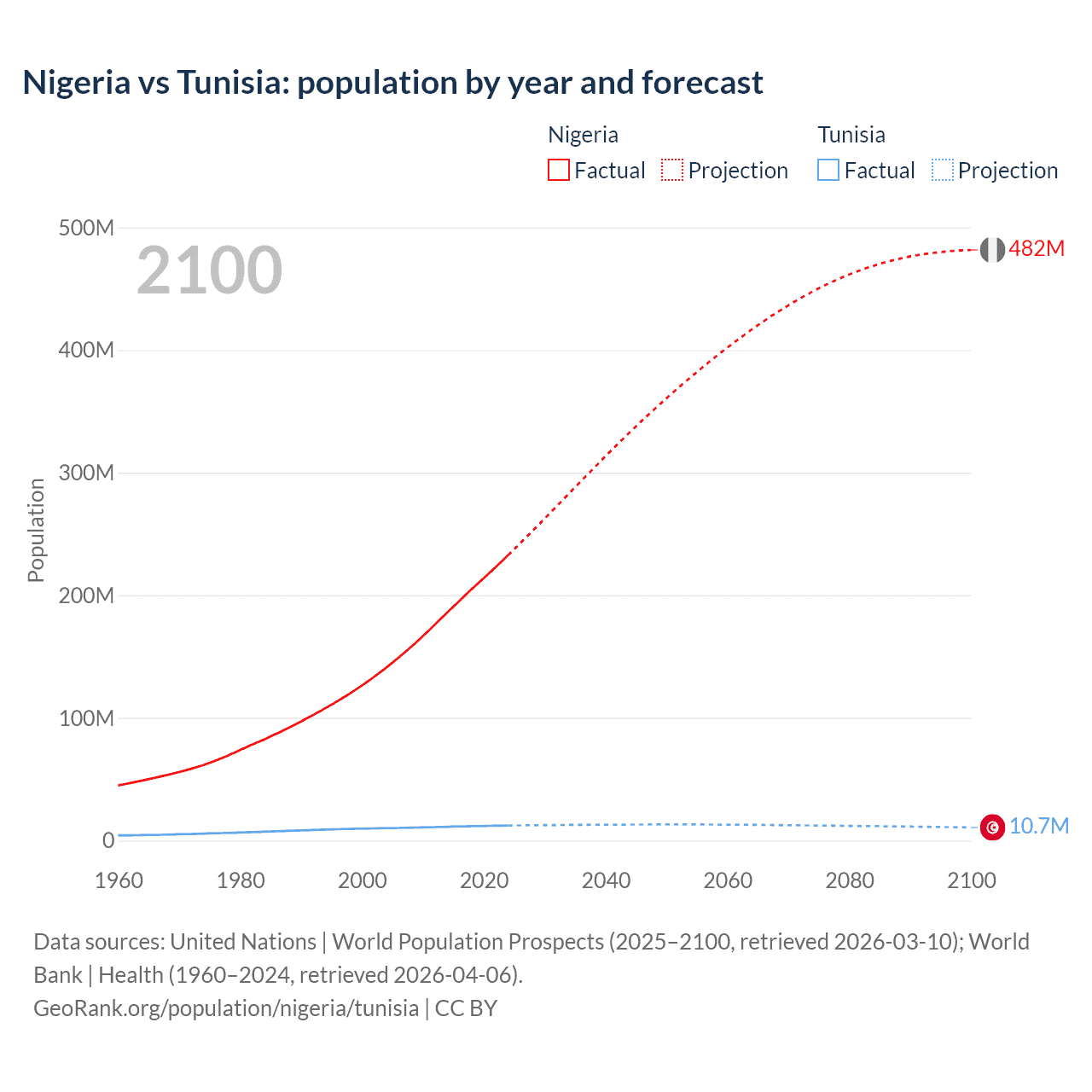 The latest officially reported population of Nigeria was 232,679,478 in 2024 vs 12,277,109 people in Tunisia in 2024. In 2026, based on the adjusted UN estimation, the current Nigeria's population is 243,824,469 people compared to 12,437,803 in Tunisia.