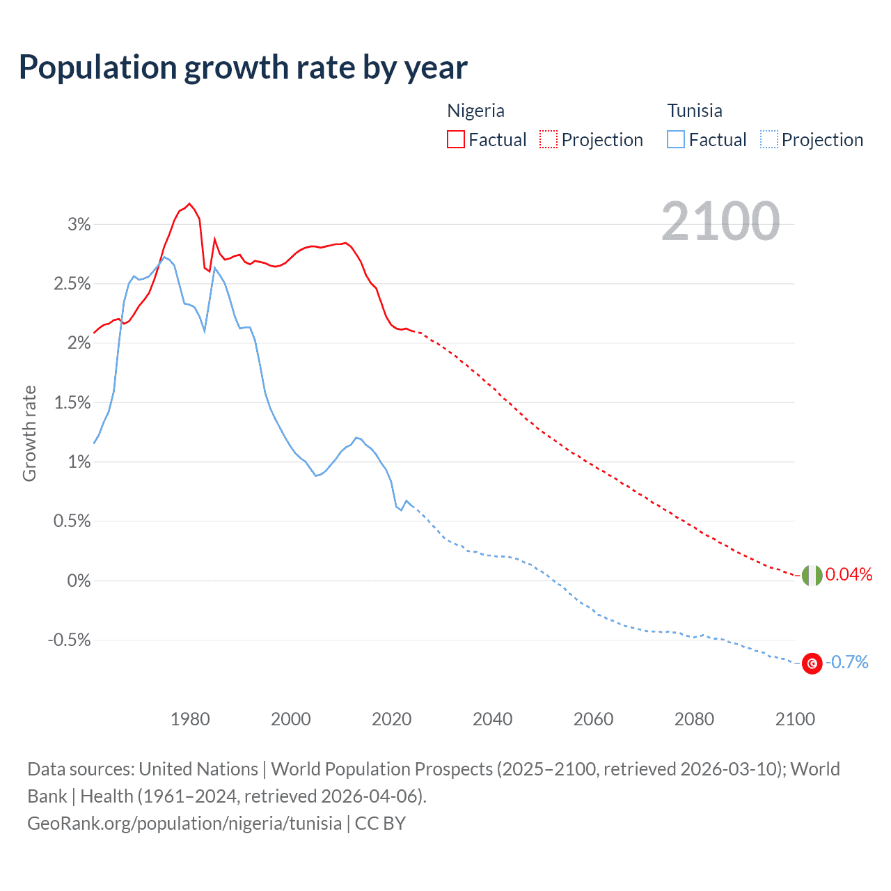 - For the last 10 years, Nigeria has had an average growth rate of +2.31% per year vs +0.89% in Tunisia.