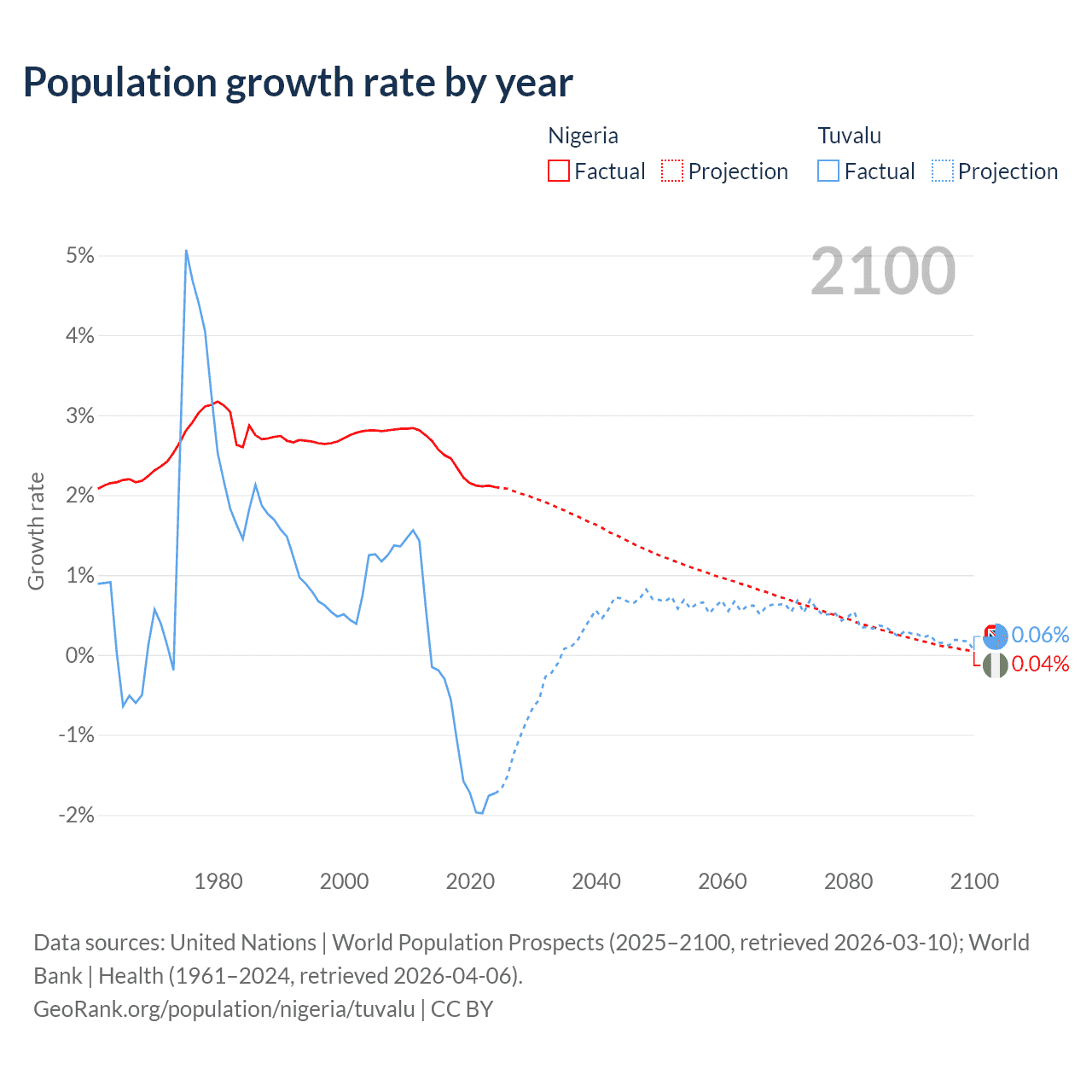 - For the last 10 years, Nigeria has had an average growth rate of +2.31% per year vs -1.19% in Tuvalu.