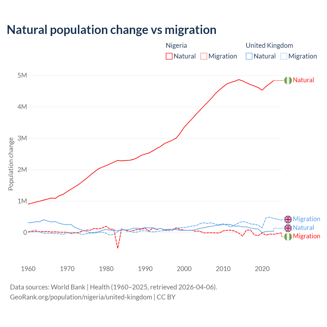 Over the last 10 years, 99.2% of the population change in Nigeria is from natural causes (a gain of 47,163,517 people) and 0.77% is from migration (a loss of 368,103 people). In the United Kingdom 23.9% is from natural causes (a gain of 1,033,129 people) and 76.1% is from migration (a gain of 3,283,101 people).