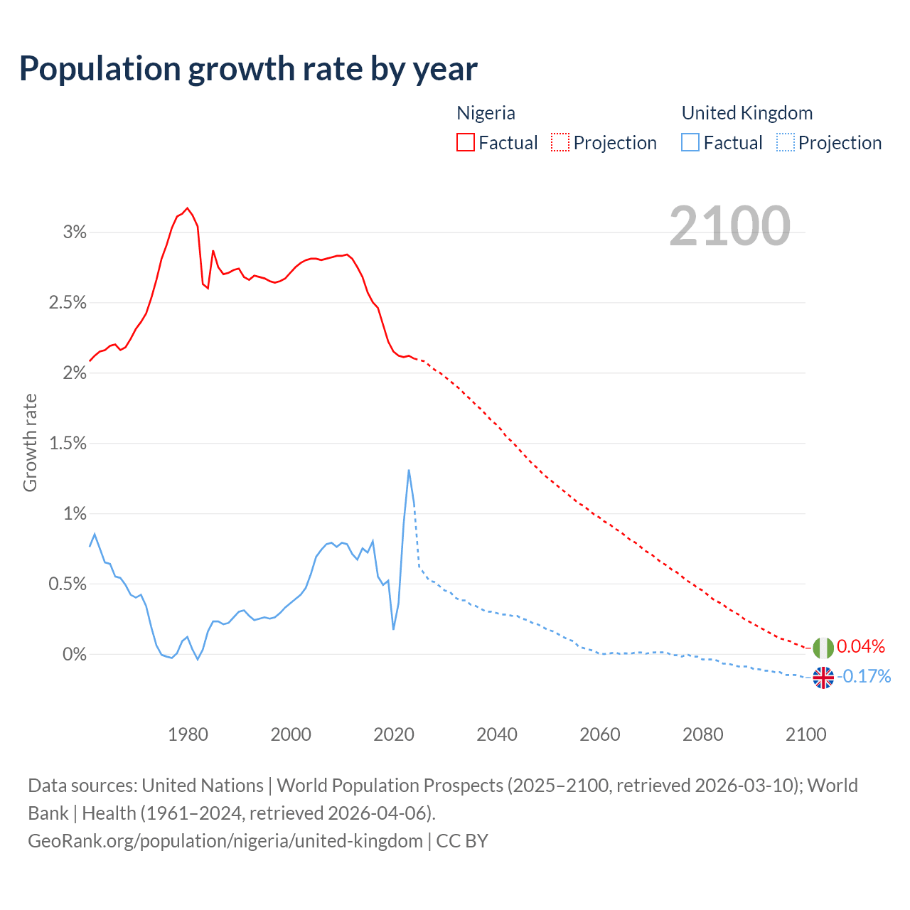 Data sources: World Bank | Health (1960–2024, retrieved 2026-04-06); United Nations | World Population Prospects (1960–2026, retrieved 2026-03-10); U.S. Census Bureau (1960–2025, retrieved 2026-02-08); Central Intelligence Agency (CIA) (2000–2019, retrieved 2026-02-20).