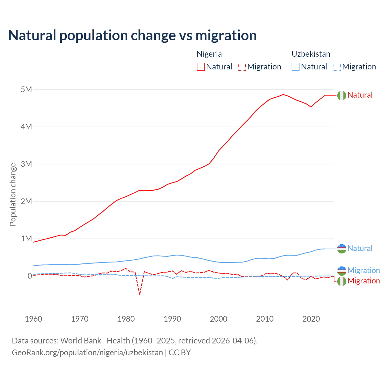 Over the last 10 years, 99.2% of the population change in Nigeria is from natural causes (a gain of 47,163,517 people) and 0.77% is from migration (a loss of 368,103 people). In Uzbekistan 98.2% is from natural causes (a gain of 6,161,117 people) and 1.84% is from migration (a loss of 115,398 people).