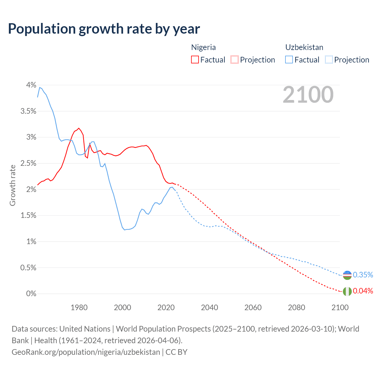 - For the last 10 years, Nigeria has had an average growth rate of +2.31% per year vs +1.85% in Uzbekistan.