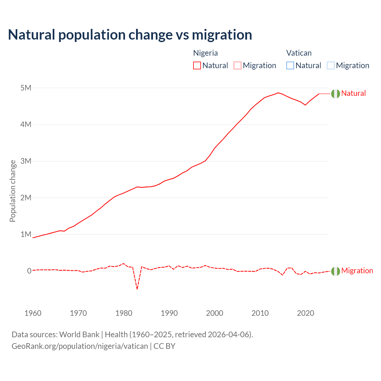 - For the last 10 years, Nigeria has had an average growth rate of +2.31% per year vs +1.9% in the Vatican.