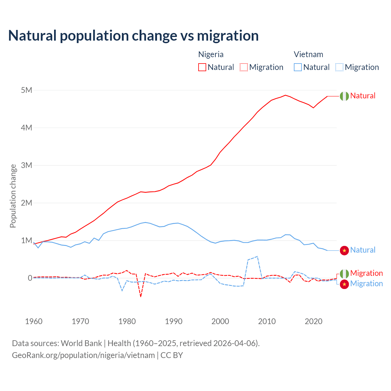 Over the last 10 years, 99.2% of the population change in Nigeria is from natural causes (a gain of 47,163,517 people) and 0.77% is from migration (a loss of 368,103 people). In Vietnam 97.7% is from natural causes (a gain of 9,349,756 people) and 2.29% is from migration (a gain of 219,073 people).