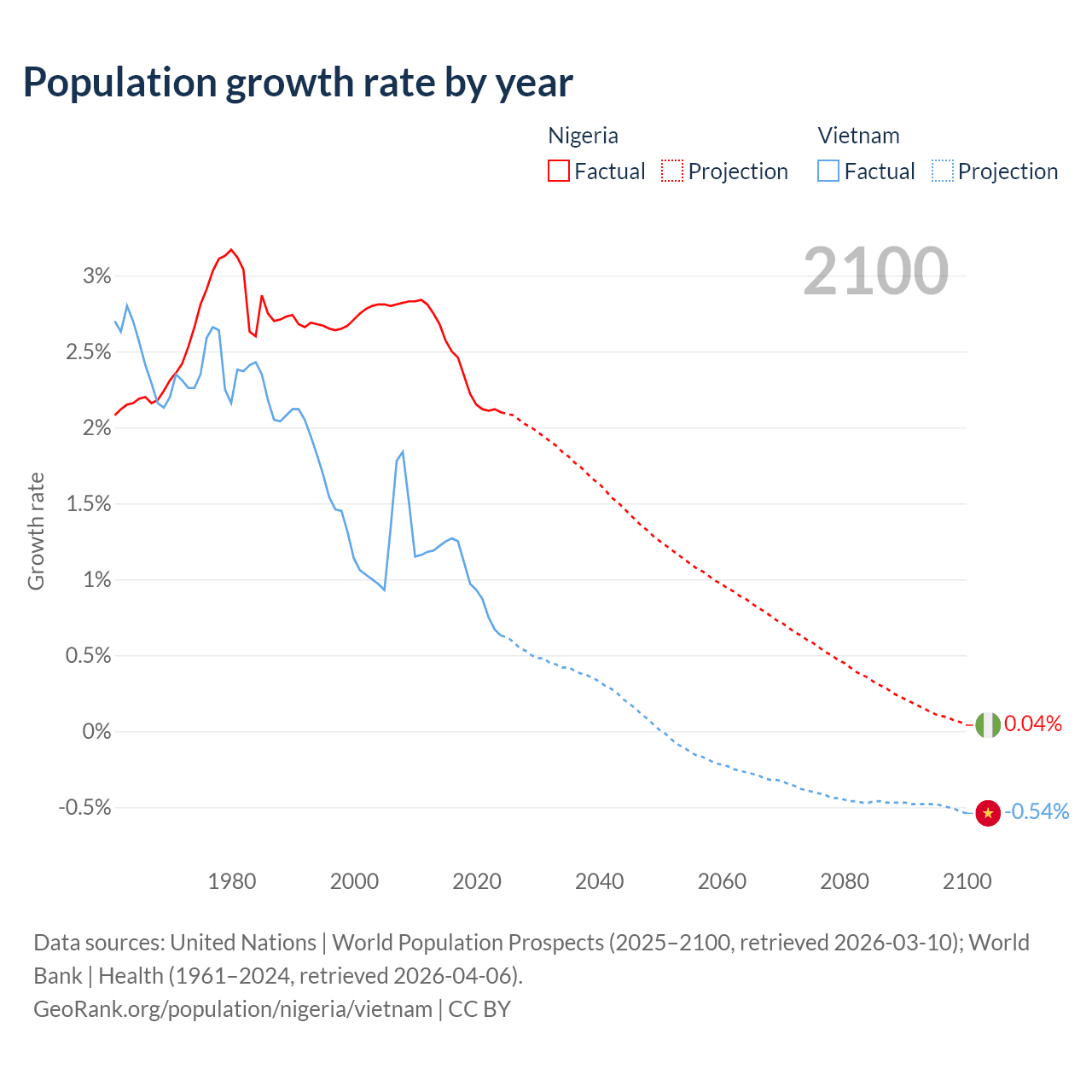 Data sources: World Bank | Health (1960–2024, retrieved 2026-04-06); United Nations | World Population Prospects (1960–2026, retrieved 2026-03-10); U.S. Census Bureau (1960–2025, retrieved 2026-02-08); Central Intelligence Agency (CIA) (2000–2019, retrieved 2026-02-20).