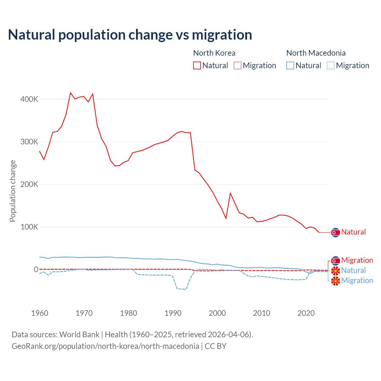 Over the last 10 years, 97.7% of the population change in North Korea is from natural causes (a gain of 1,097,372 people) and 2.33% is from migration (a loss of 26,227 people). In North Macedonia 6.45% is from natural causes (a loss of 12,585 people) and 93.5% is from migration (a loss of 182,429 people).