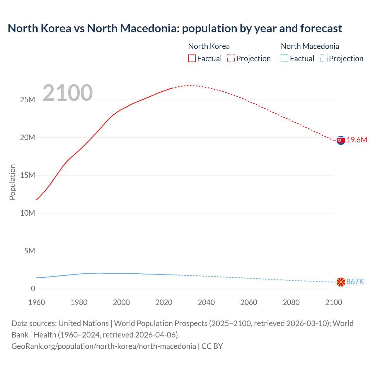 The latest officially reported population of North Korea was 26,498,823 in 2024 vs 1,824,359 people in North Macedonia in 2024. In 2026, based on the adjusted UN estimation, the current North Korea's population is 26,659,144 people compared to 1,805,954 in North Macedonia.