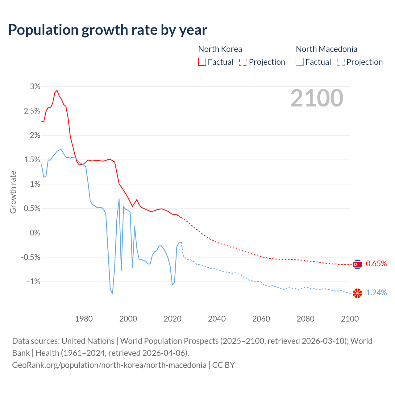- For the last 10 years, North Korea has had an average growth rate of +0.41% per year vs -0.48% in North Macedonia.