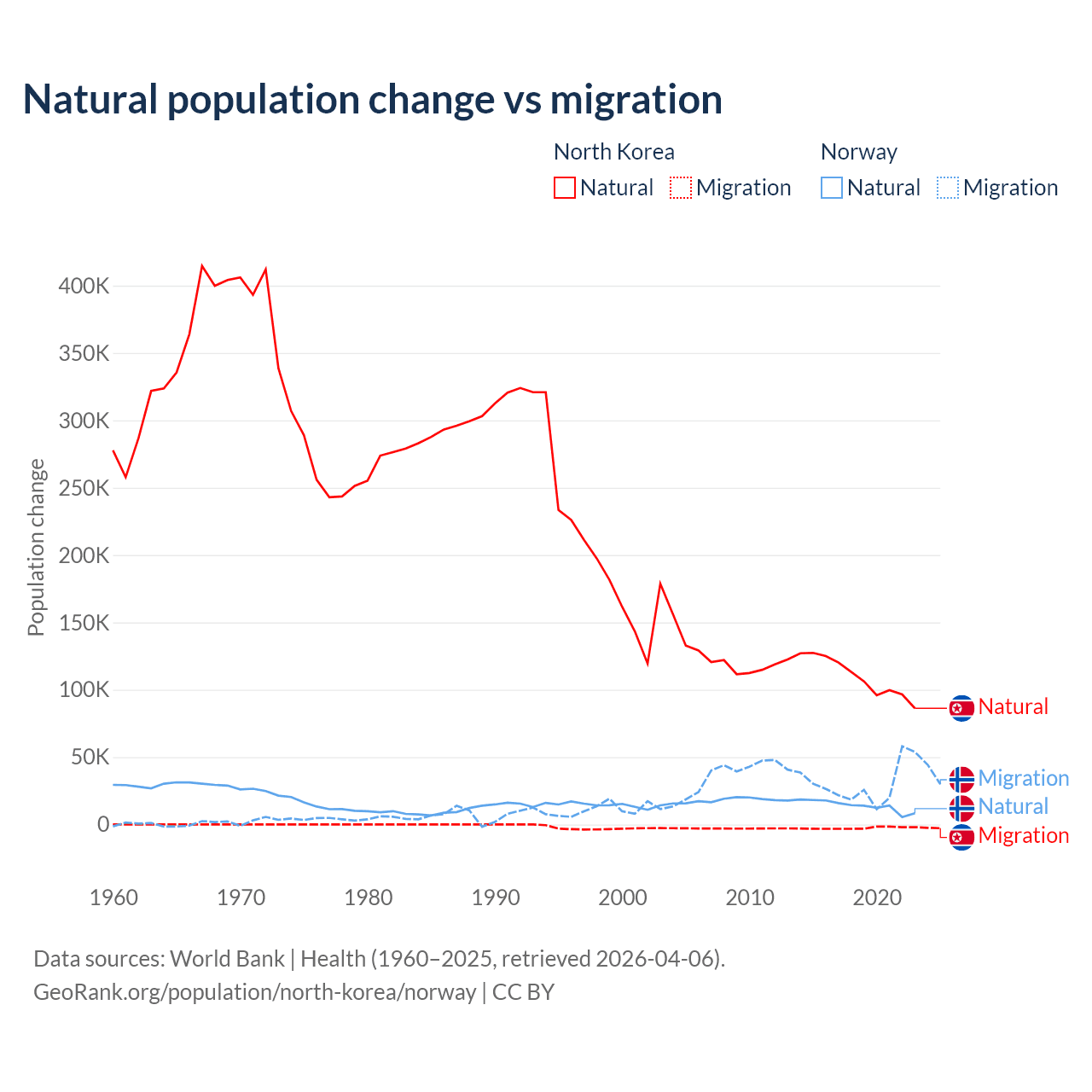 Over the last 10 years, 97.7% of the population change in North Korea is from natural causes (a gain of 1,097,372 people) and 2.33% is from migration (a loss of 26,227 people). In Norway 31.3% is from natural causes (a gain of 138,699 people) and 68.7% is from migration (a gain of 303,945 people).