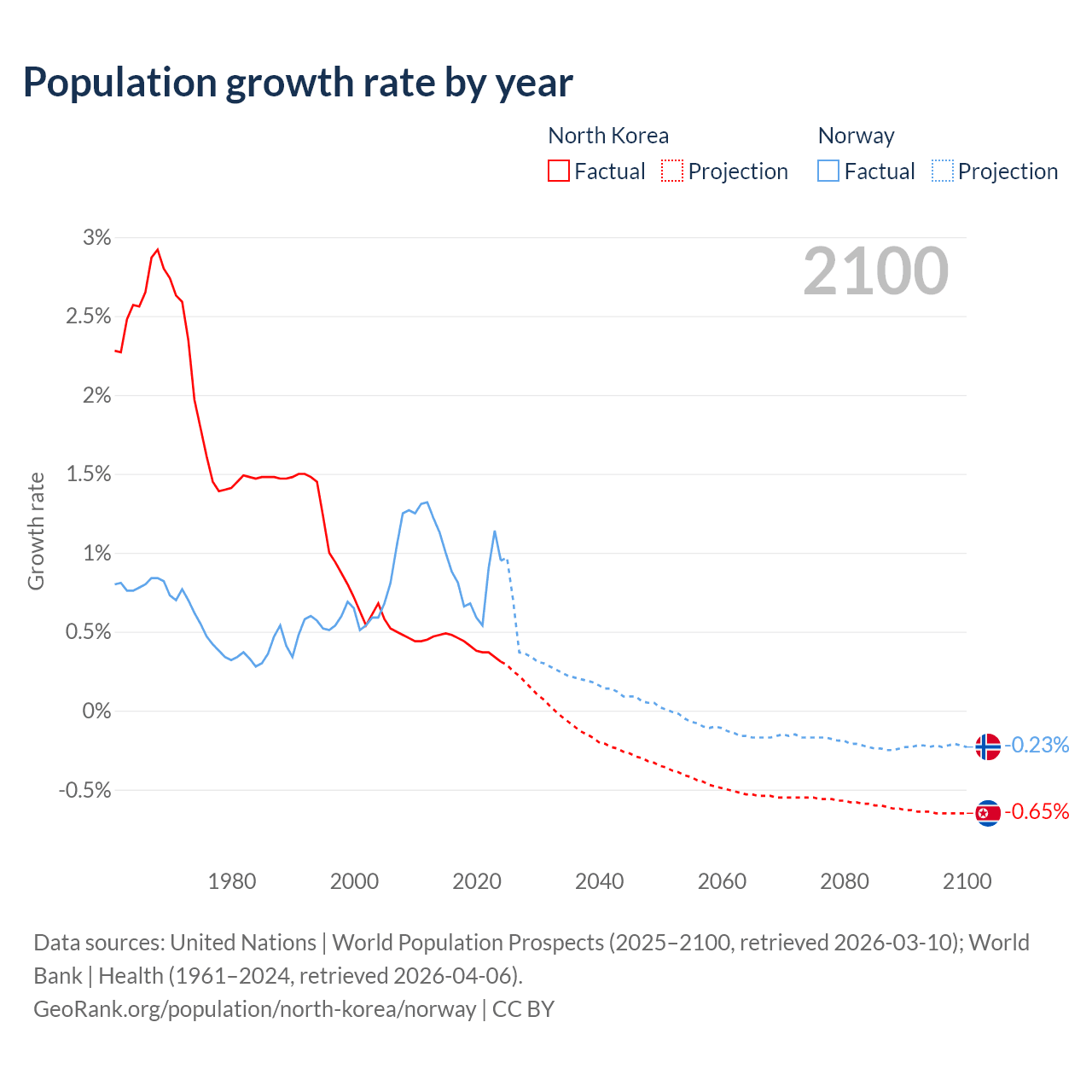 - For the last 10 years, North Korea has had an average growth rate of +0.41% per year vs +0.85% in Norway.