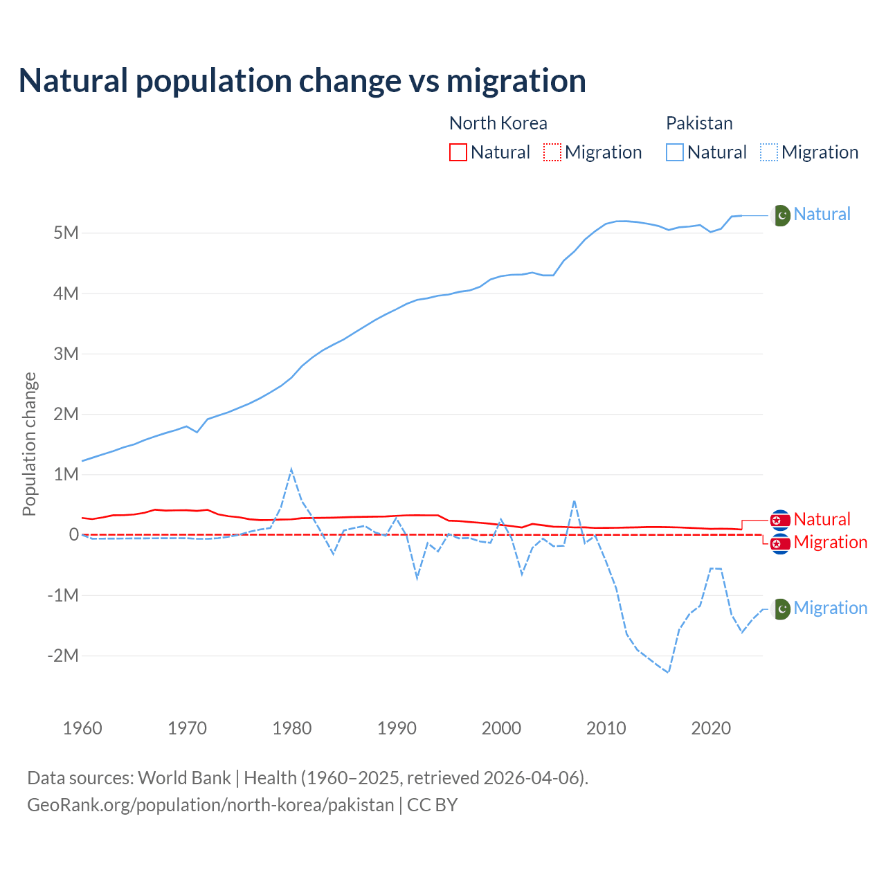 Over the last 10 years, 97.7% of the population change in North Korea is from natural causes (a gain of 1,097,372 people) and 2.33% is from migration (a loss of 26,227 people). In Pakistan 77.8% is from natural causes (a gain of 51,255,404 people) and 22.2% is from migration (a loss of 14,629,055 people).