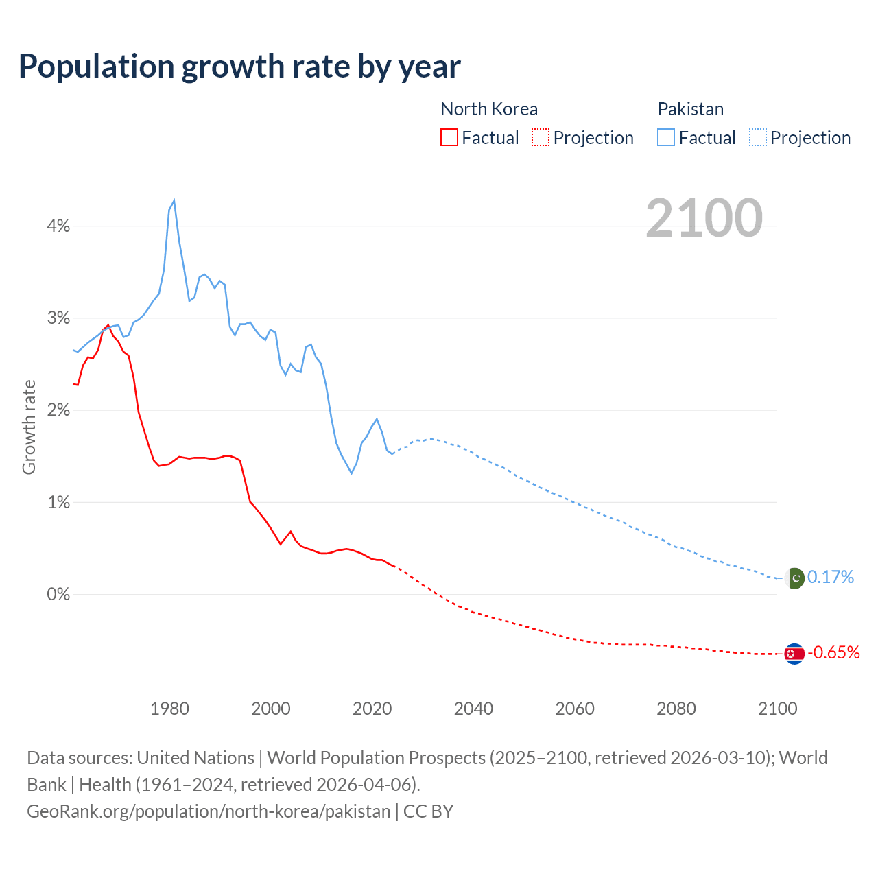 - For the last 10 years, North Korea has had an average growth rate of +0.41% per year vs +1.6% in Pakistan.
