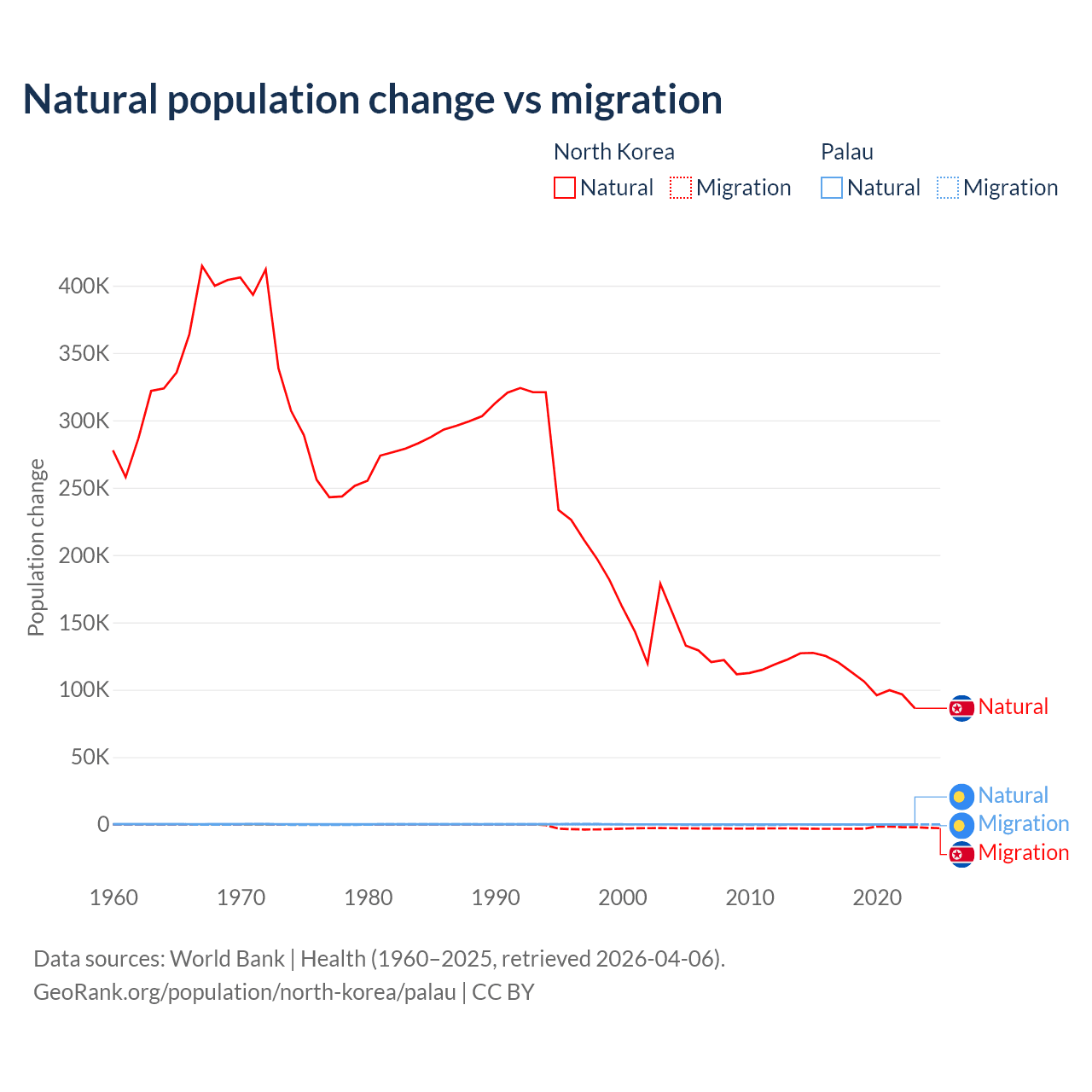 Over the last 10 years, 97.7% of the population change in North Korea is from natural causes (a gain of 1,097,372 people) and 2.33% is from migration (a loss of 26,227 people). In Palau 53.8% is from natural causes (a gain of 264 people) and 46.2% is from migration (a loss of 227 people).