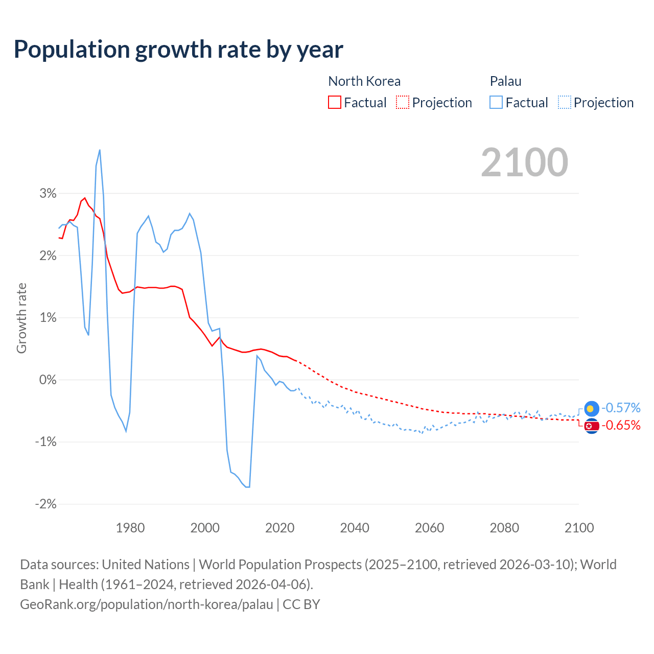 - For the last 10 years, North Korea has had an average growth rate of +0.41% per year vs +0.02% in Palau.