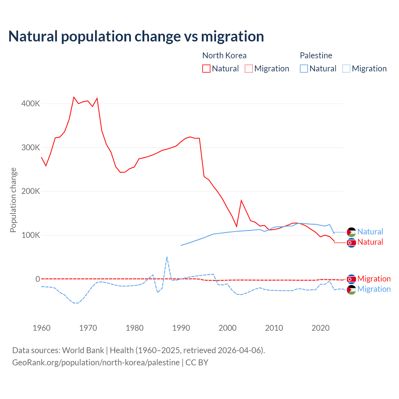 Over the last 10 years, 97.7% of the population change in North Korea is from natural causes (a gain of 1,097,372 people) and 2.33% is from migration (a loss of 26,227 people). In Palestine 85.7% is from natural causes (a gain of 1,218,010 people) and 14.3% is from migration (a loss of 202,820 people).