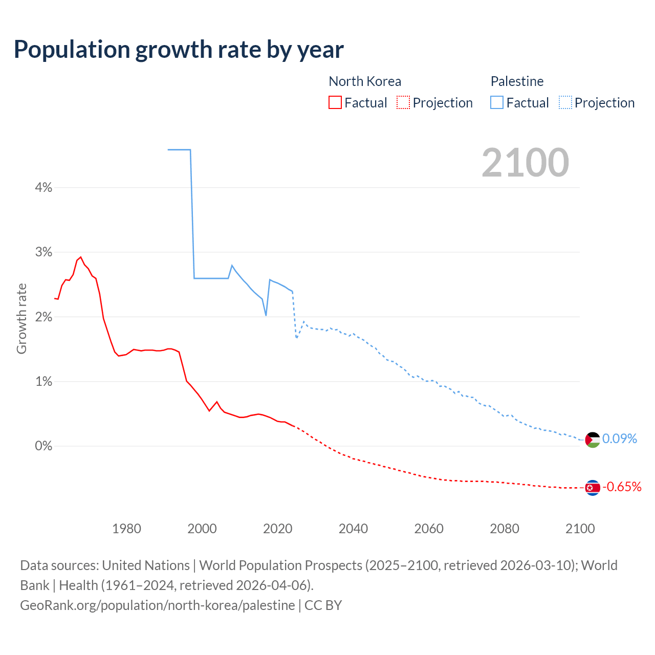 - For the last 10 years, North Korea has had an average growth rate of +0.41% per year vs +2.4% in Palestine.