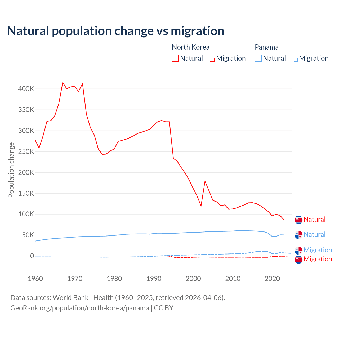 Over the last 10 years, 97.7% of the population change in North Korea is from natural causes (a gain of 1,097,372 people) and 2.33% is from migration (a loss of 26,227 people). In Panama 86.5% is from natural causes (a gain of 544,211 people) and 13.5% is from migration (a gain of 84,849 people).