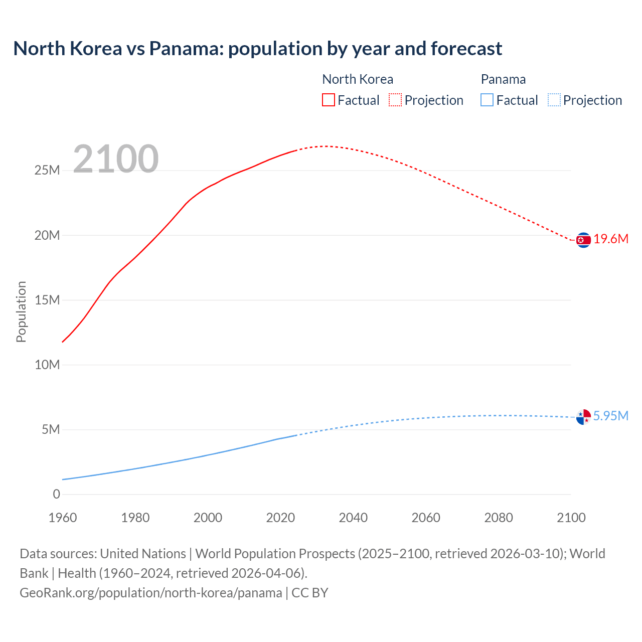 The latest officially reported population of North Korea was 26,498,823 in 2024 vs 4,515,577 people in Panama in 2024. In 2026, based on the adjusted UN estimation, the current North Korea's population is 26,659,144 people compared to 4,642,198 in Panama.