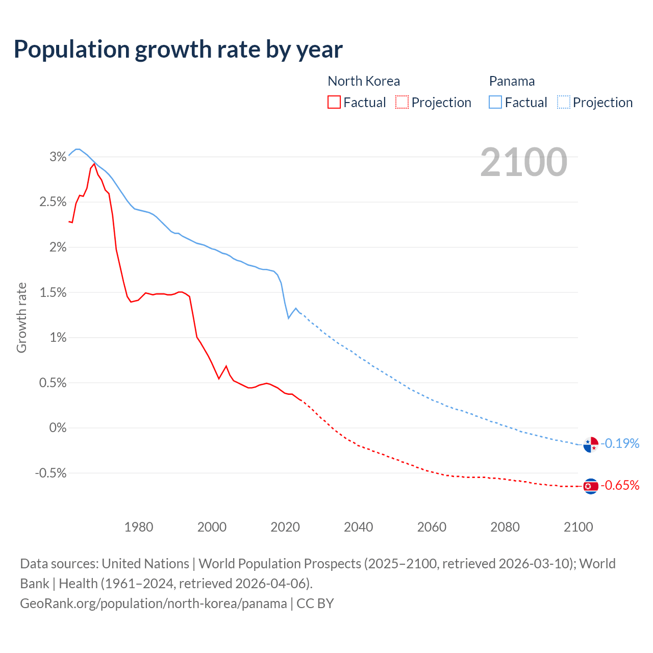 - For the last 10 years, North Korea has had an average growth rate of +0.41% per year vs +1.52% in Panama.