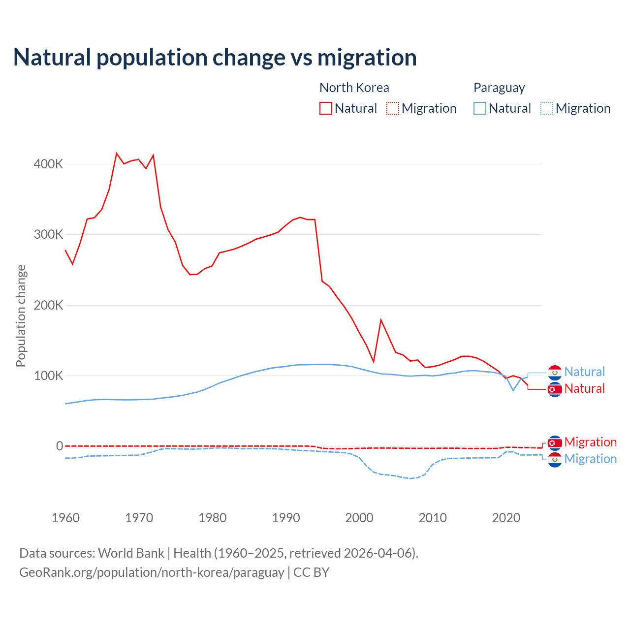 Over the last 10 years, 97.7% of the population change in North Korea is from natural causes (a gain of 1,097,372 people) and 2.33% is from migration (a loss of 26,227 people). In Paraguay 87.6% is from natural causes (a gain of 1,002,636 people) and 12.4% is from migration (a loss of 141,377 people).