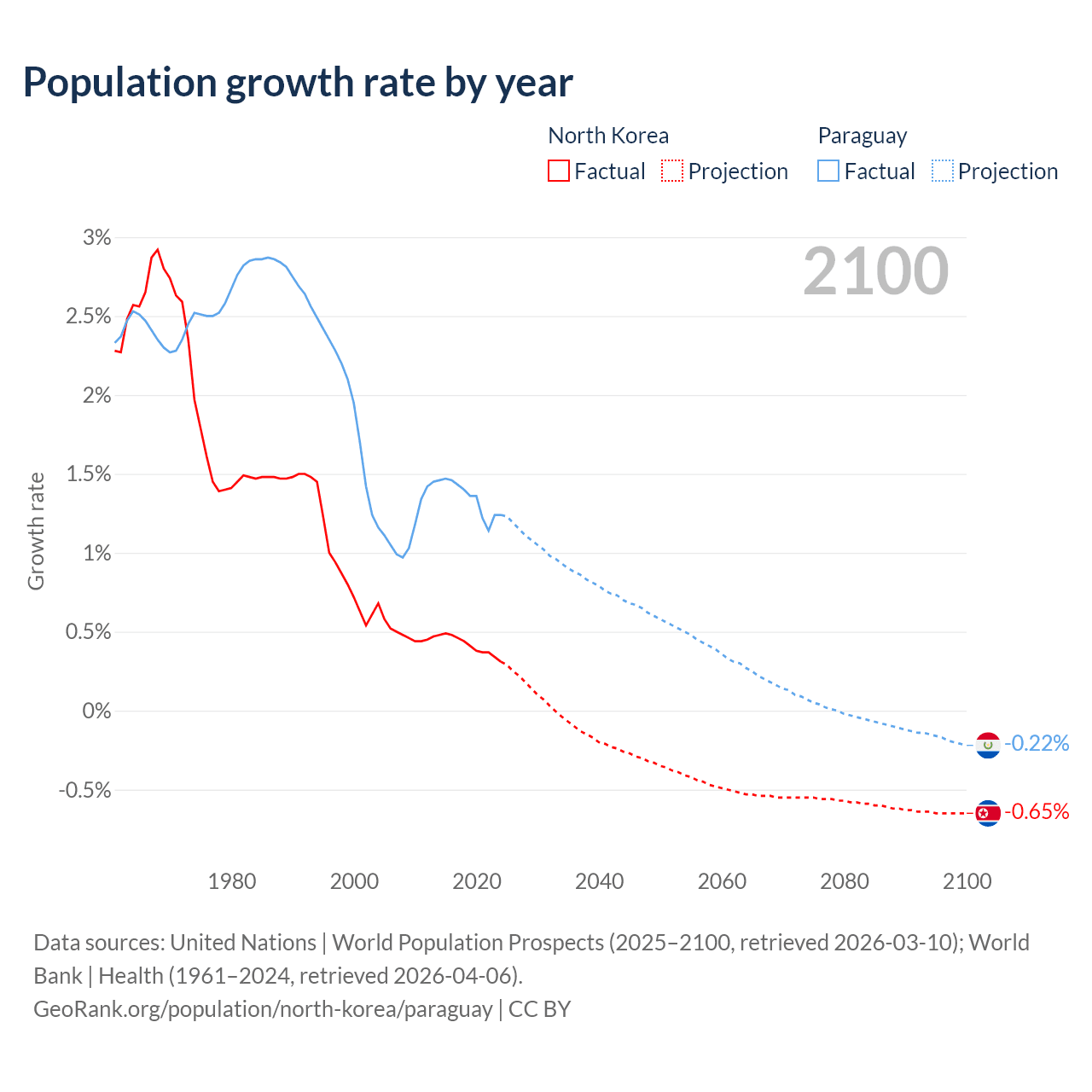 - For the last 10 years, North Korea has had an average growth rate of +0.41% per year vs +1.34% in Paraguay.