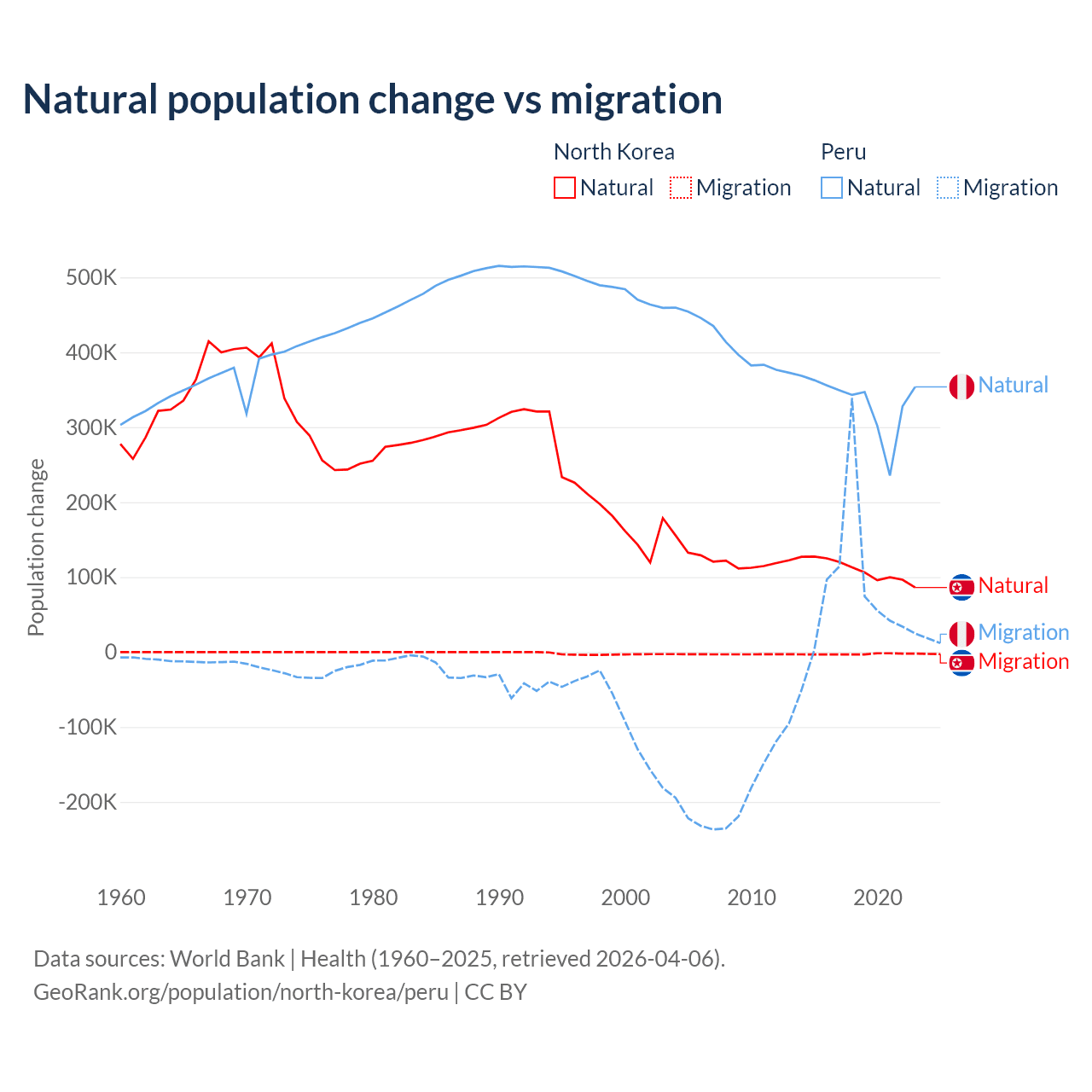 Over the last 10 years, 97.7% of the population change in North Korea is from natural causes (a gain of 1,097,372 people) and 2.33% is from migration (a loss of 26,227 people). In Peru 82% is from natural causes (a gain of 3,345,822 people) and 18% is from migration (a gain of 732,505 people).