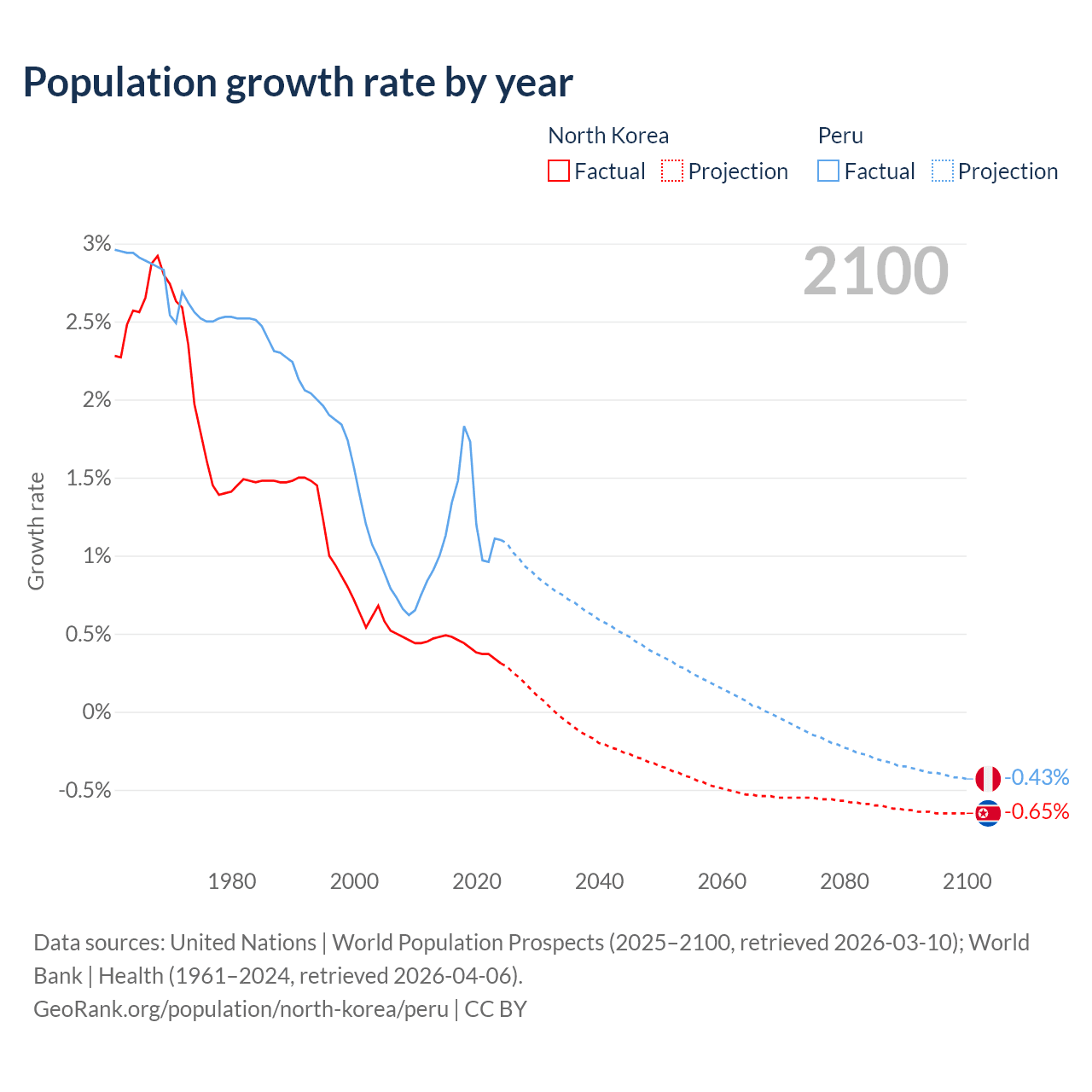 - For the last 10 years, North Korea has had an average growth rate of +0.41% per year vs +1.26% in Peru.
