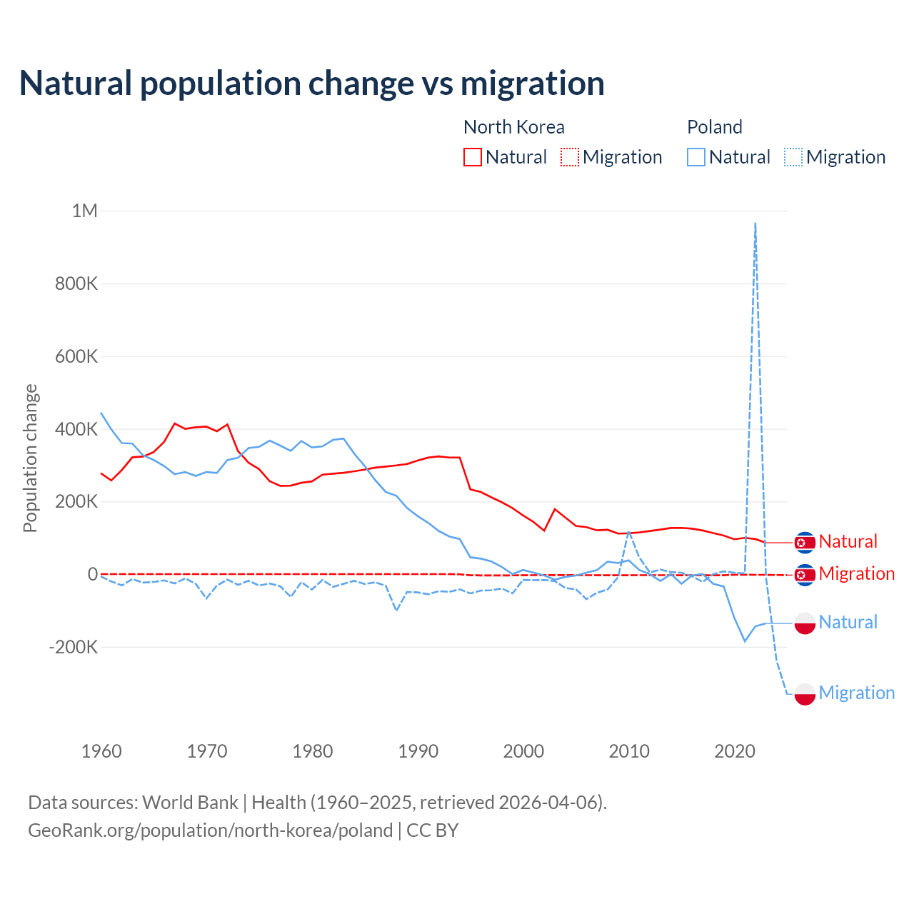 Over the last 10 years, 97.7% of the population change in North Korea is from natural causes (a gain of 1,097,372 people) and 2.33% is from migration (a loss of 26,227 people). In Poland 41.4% is from natural causes (a loss of 675,443 people) and 58.6% is from migration (a gain of 955,766 people).