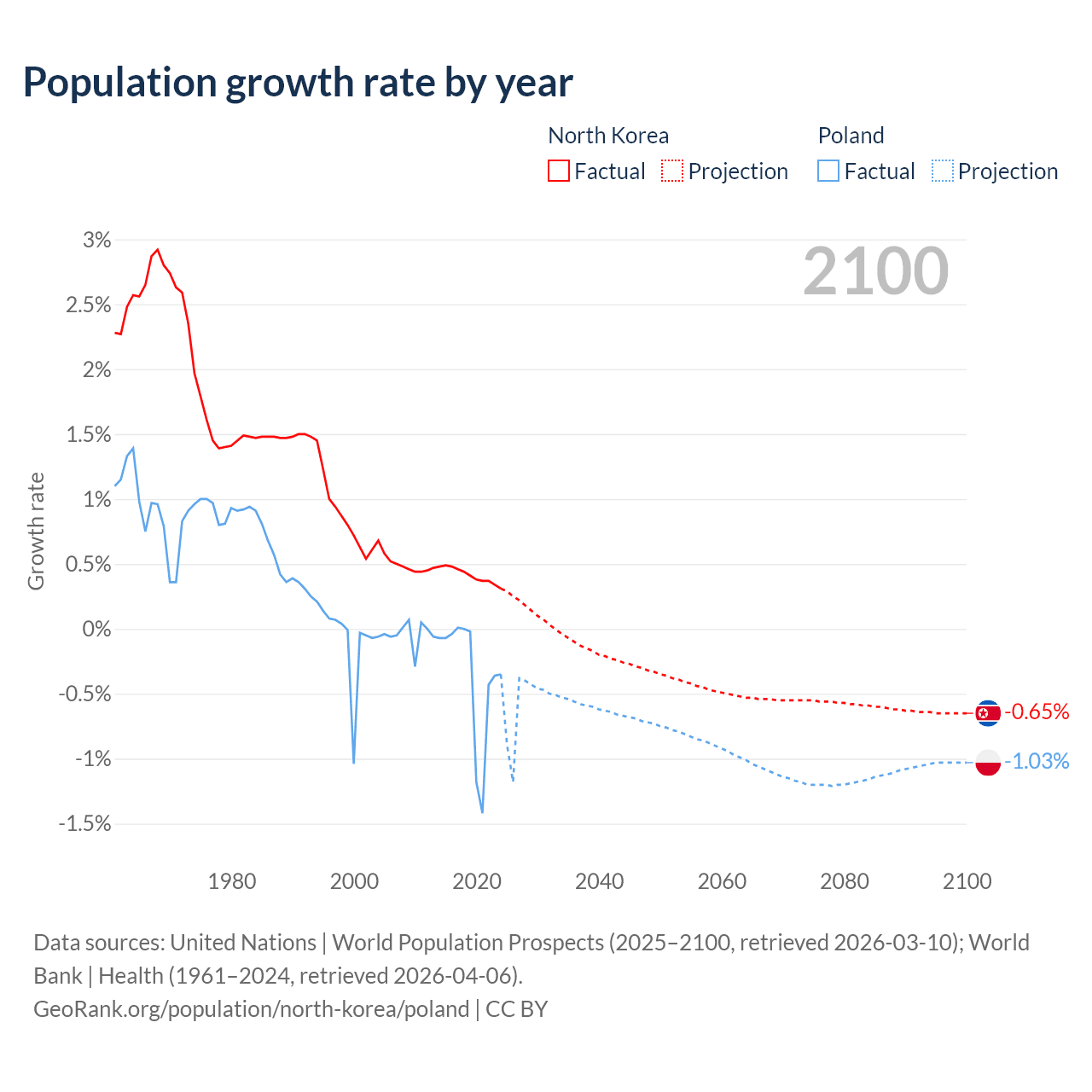 - For the last 10 years, North Korea has had an average growth rate of +0.41% per year vs -0.36% in Poland.