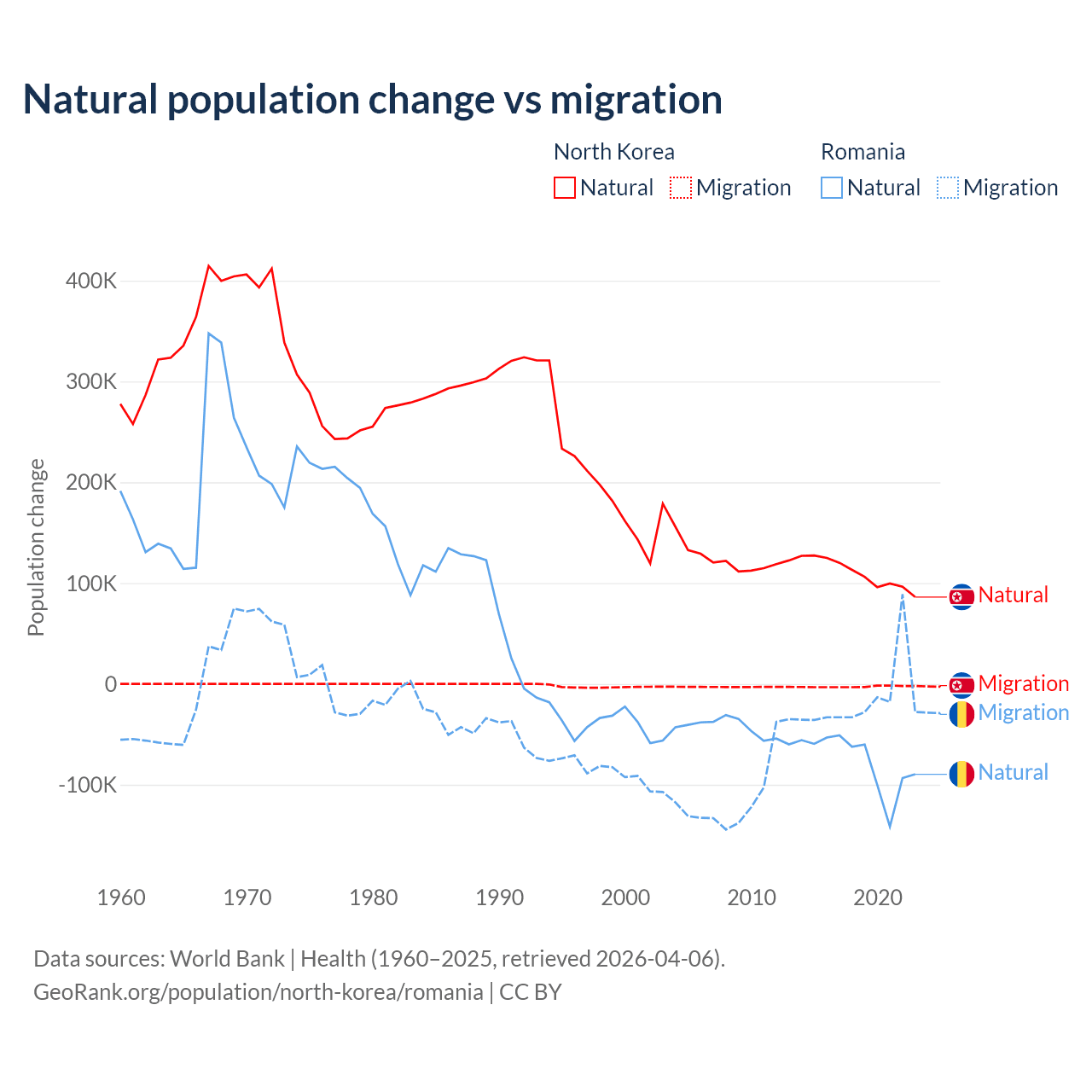 Over the last 10 years, 97.7% of the population change in North Korea is from natural causes (a gain of 1,097,372 people) and 2.33% is from migration (a loss of 26,227 people). In Romania 82% is from natural causes (a loss of 766,295 people) and 18% is from migration (a loss of 167,917 people).