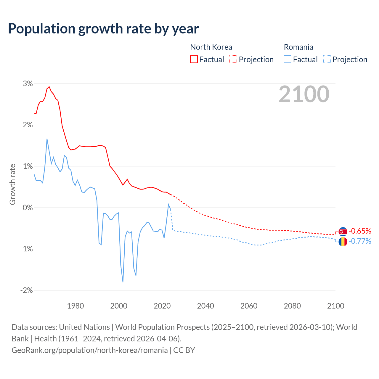 - For the last 10 years, North Korea has had an average growth rate of +0.41% per year vs -0.43% in Romania.