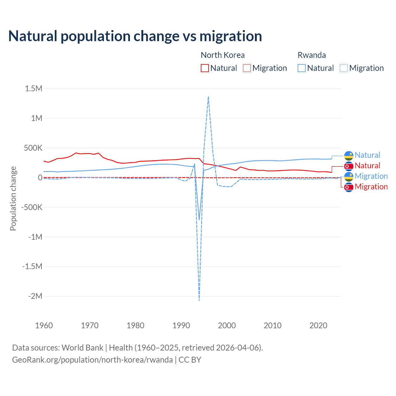 Over the last 10 years, 97.7% of the population change in North Korea is from natural causes (a gain of 1,097,372 people) and 2.33% is from migration (a loss of 26,227 people). In Rwanda 93.8% is from natural causes (a gain of 3,081,296 people) and 6.18% is from migration (a loss of 203,035 people).