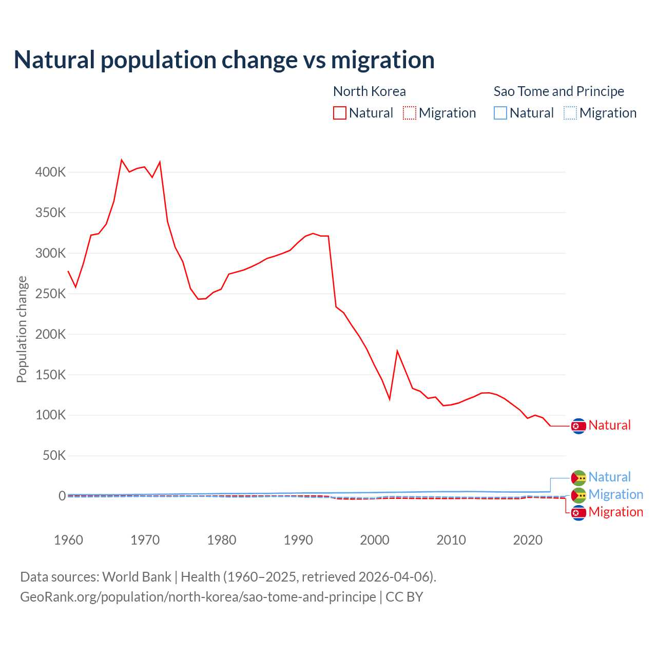 Over the last 10 years, 97.7% of the population change in North Korea is from natural causes (a gain of 1,097,372 people) and 2.33% is from migration (a loss of 26,227 people). In Sao Tome and Principe 80.1% is from natural causes (a gain of 50,822 people) and 19.9% is from migration (a loss of 12,621 people).