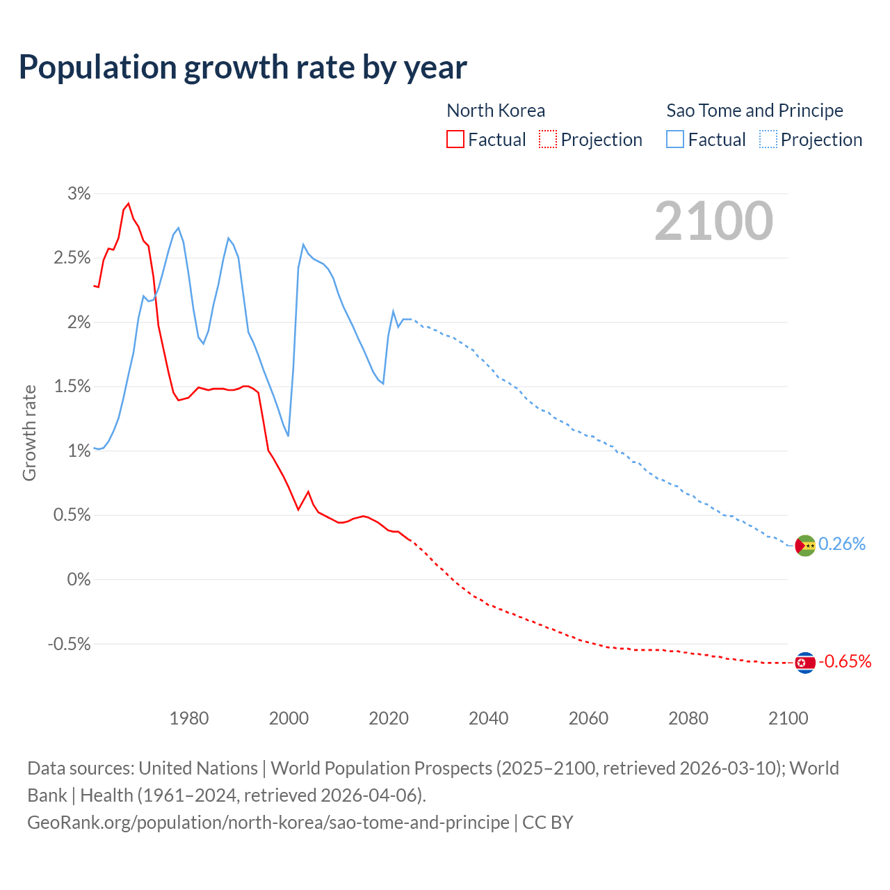 - For the last 10 years, North Korea has had an average growth rate of +0.41% per year vs +1.82% in Sao Tome and Principe.