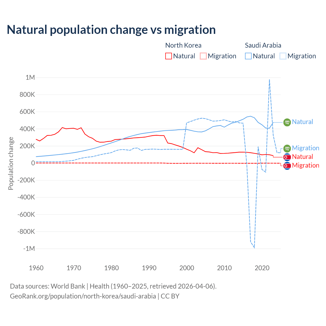 Over the last 10 years, 97.7% of the population change in North Korea is from natural causes (a gain of 1,097,372 people) and 2.33% is from migration (a loss of 26,227 people). In Saudi Arabia 93.9% is from natural causes (a gain of 4,829,562 people) and 6.05% is from migration (a gain of 311,209 people).