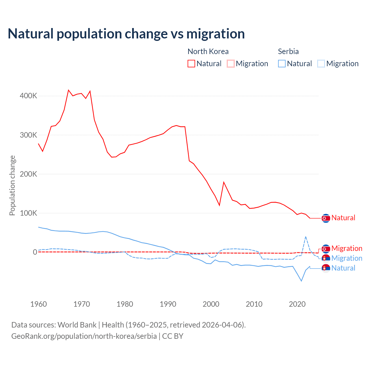 Over the last 10 years, 97.7% of the population change in North Korea is from natural causes (a gain of 1,097,372 people) and 2.33% is from migration (a loss of 26,227 people). In Serbia 83.3% is from natural causes (a loss of 435,148 people) and 16.7% is from migration (a loss of 87,110 people).
