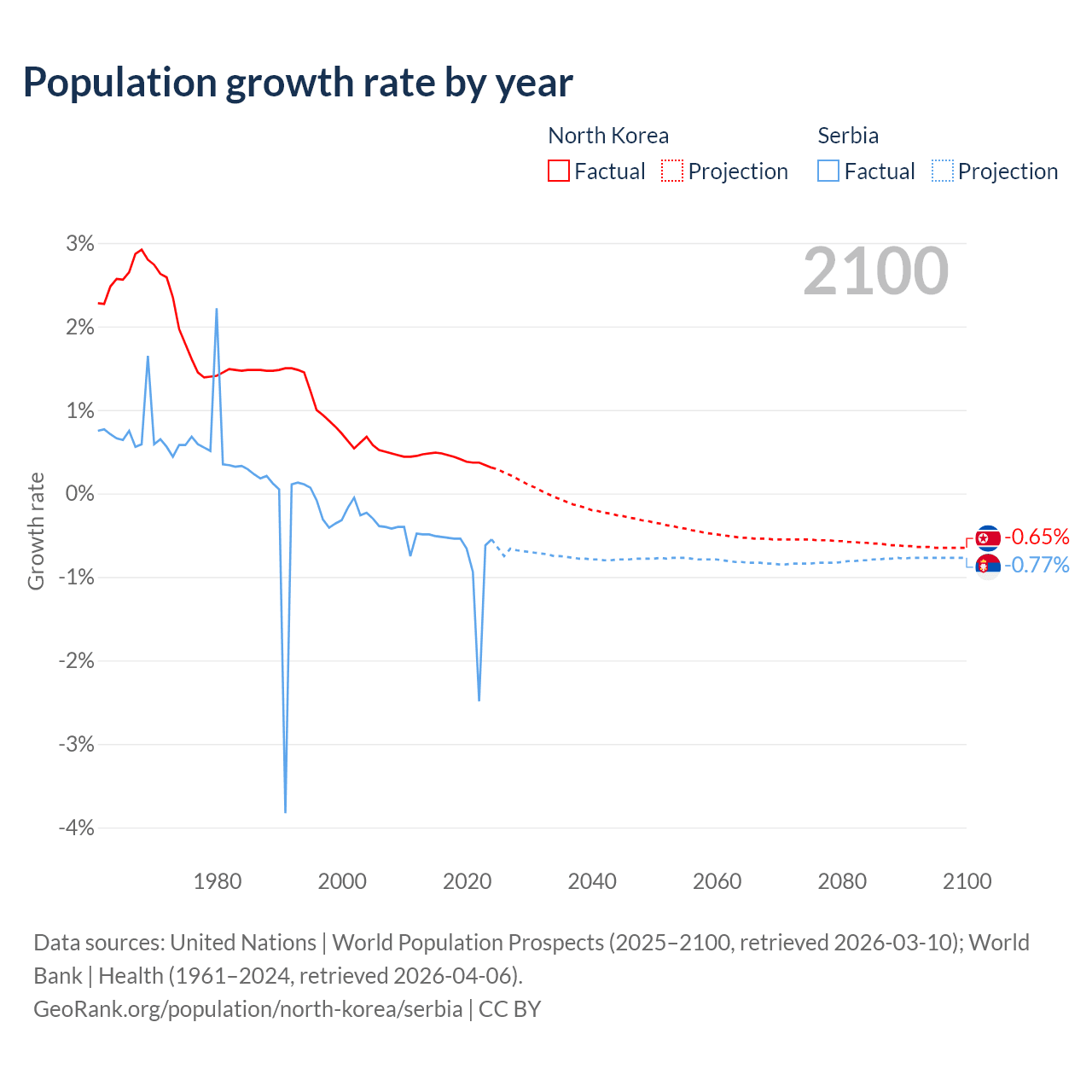 - For the last 10 years, North Korea has had an average growth rate of +0.41% per year vs -0.76% in Serbia.