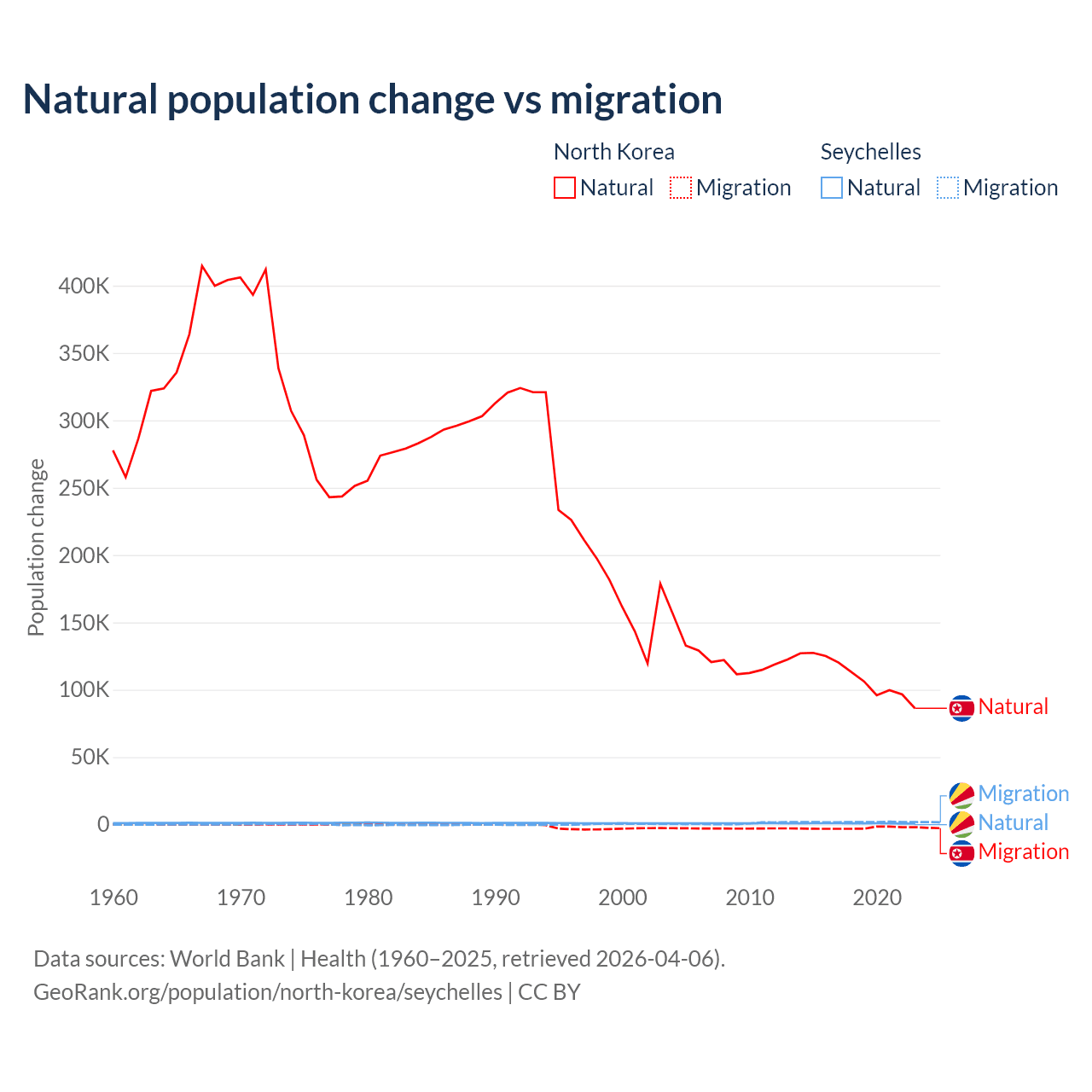 Over the last 10 years, 97.7% of the population change in North Korea is from natural causes (a gain of 1,097,372 people) and 2.33% is from migration (a loss of 26,227 people). In the Seychelles 31.4% is from natural causes (a gain of 8,122 people) and 68.6% is from migration (a gain of 17,748 people).
