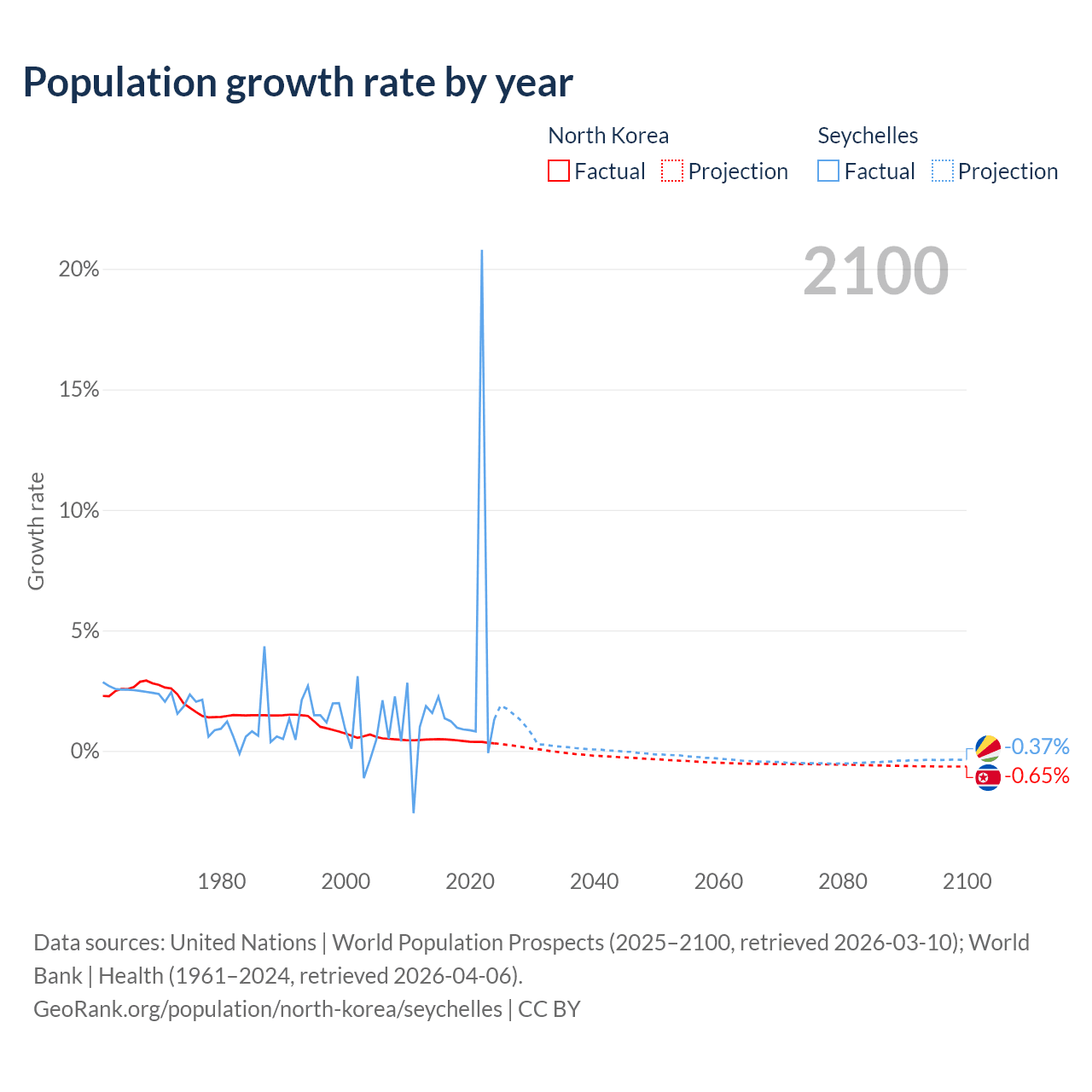 - For the last 10 years, North Korea has had an average growth rate of +0.41% per year vs +2.9% in the Seychelles.