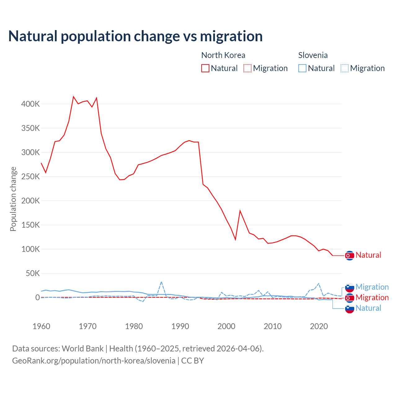 Over the last 10 years, 97.7% of the population change in North Korea is from natural causes (a gain of 1,097,372 people) and 2.33% is from migration (a loss of 26,227 people). In Slovenia 18.1% is from natural causes (a loss of 17,573 people) and 81.9% is from migration (a gain of 79,532 people).