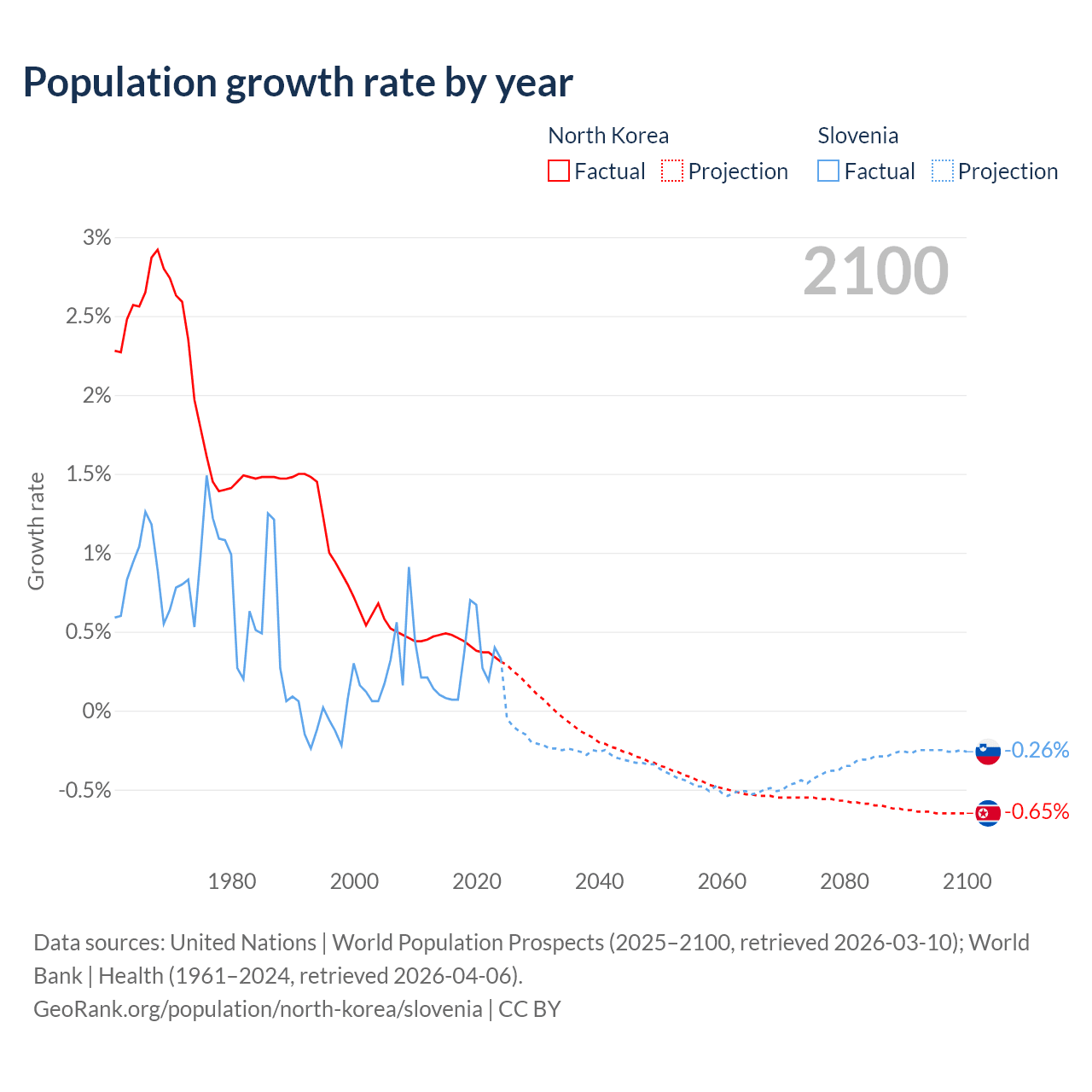 - For the last 10 years, North Korea has had an average growth rate of +0.41% per year vs +0.29% in Slovenia.