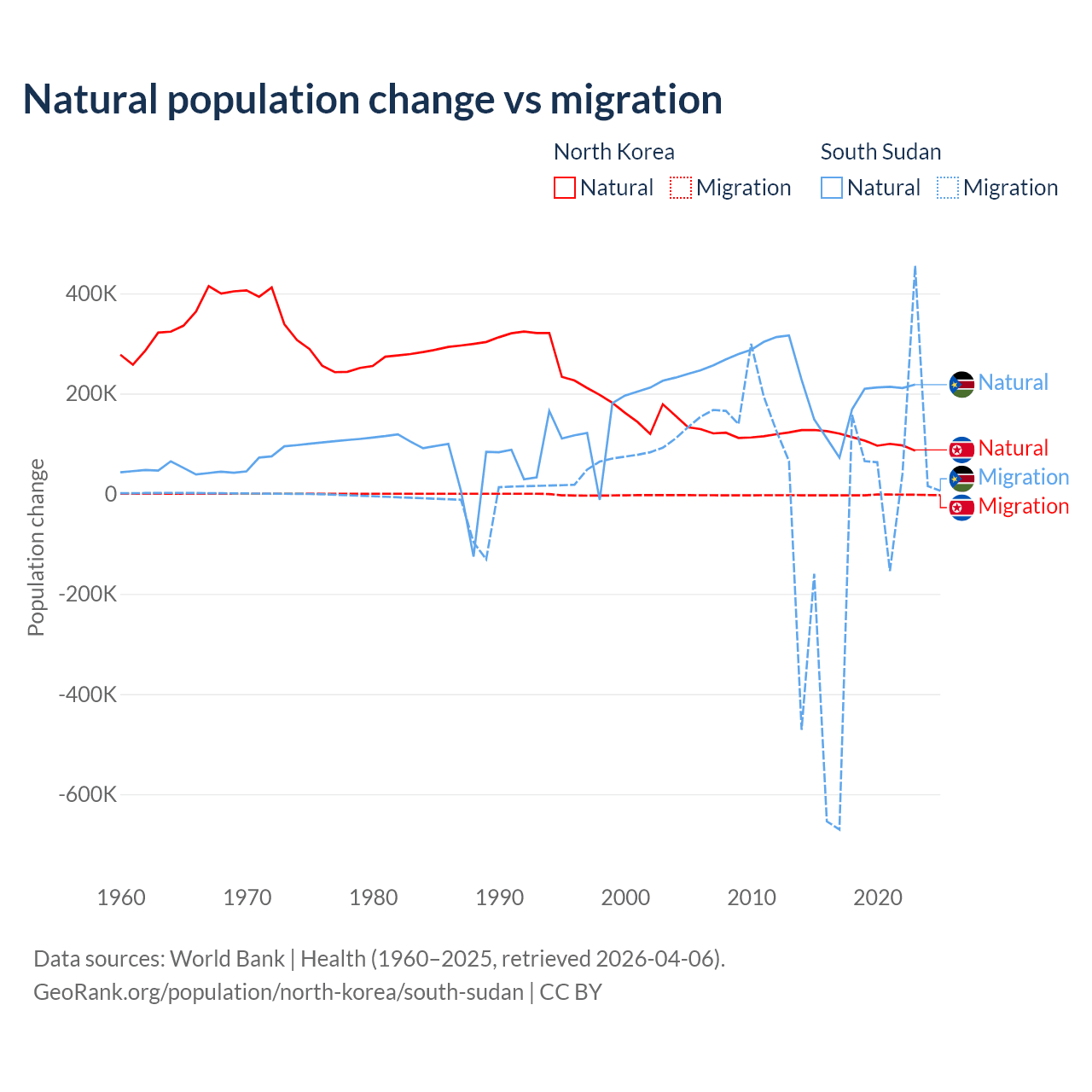 Over the last 10 years, 97.7% of the population change in North Korea is from natural causes (a gain of 1,097,372 people) and 2.33% is from migration (a loss of 26,227 people). In South Sudan 57.4% is from natural causes (a gain of 1,792,135 people) and 42.6% is from migration (a loss of 1,329,606 people).